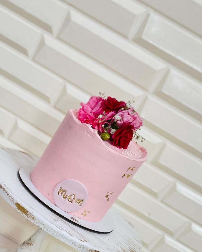 ایده تزیین کیک روز مادر 1402 ساده و شیک با خامه، گل طبیعی و میوه