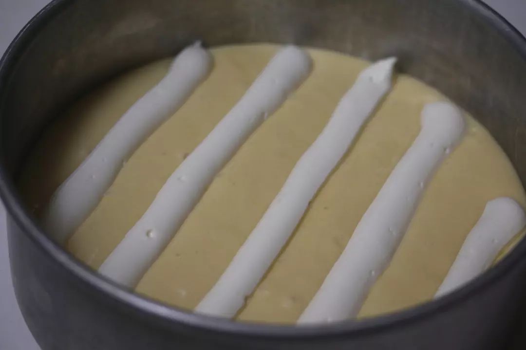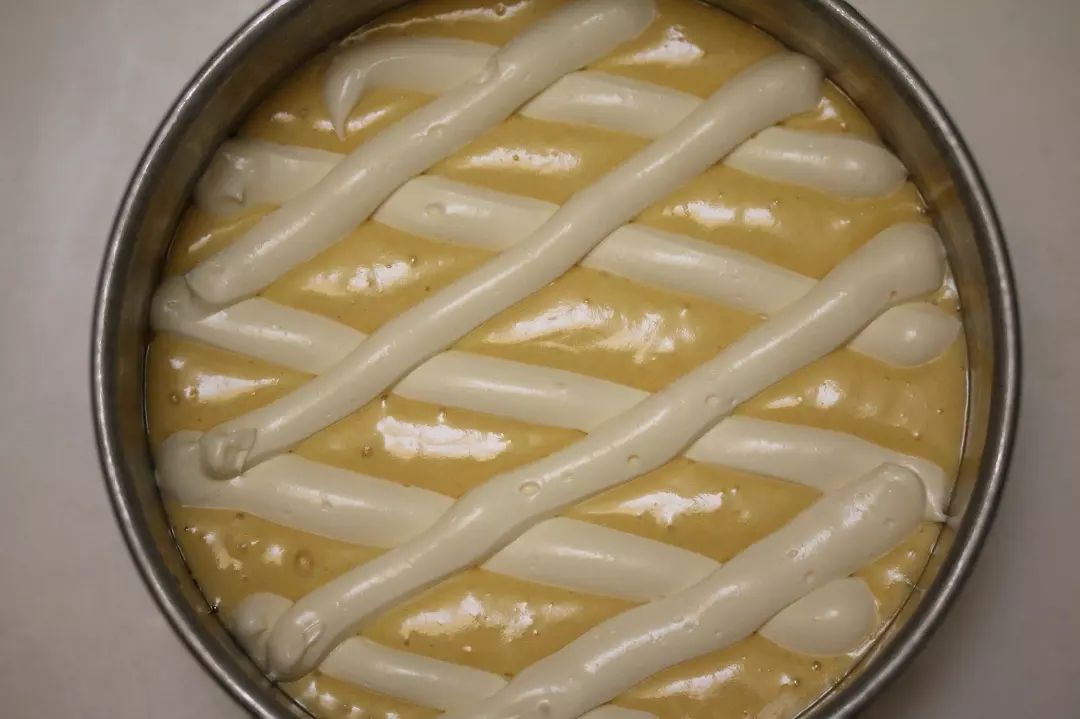 داخل قالب گرد به قطر ۱۸ حاضر کنید . کف قالب باید کاغذ روغنی پهن کنید و خمیر کیک رو بریزید و سه بار به سطح بکوبید . کرم پاتیسیر که حاضر کرده بودید رو با همزن هم بزنید تا یکدست و صاف شود بعد داخل قیف بریزید و روی خمیر رو مثل عکسی که گذاشتم شکل دهید . بذارید داخل فر که از قبل روی ۱۸۰ درجه سانتیگراد یا ۳۵۰ درجه فارنهایت روشن کرده بودید به مدت ۳۵ تا ۴۰ دقیقه بگذارید تا پخته شود و بعد در انتها به دلخواه کمی پودر شکر بپاشید. نوش جان