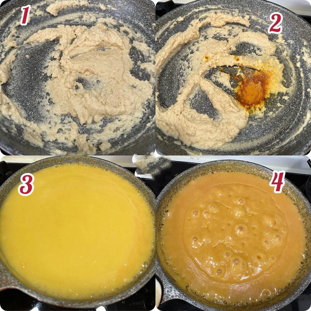 ابتدا کره را داخل تابه ریخته و روی حرارت قرار داده و آرد را داخل کره الک کرده و تفت دهید تا خامی آرد از بین برود و آرد تغییر رنگ دهد و زردچوبه و نمک را افزوده و تفت دهید، دقت کنید می توانید بجای کره از روغن حیوانی استفاده کنید ولی اگر بو آن را دوست ندارید از کره استفاده کنید.
