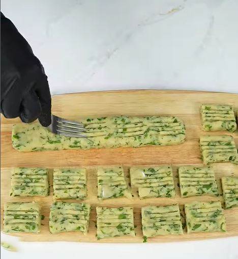در ادامه با کمک چنگال روی آن طرح ایجاد کنید و برش بزنید و با کمک چاقو به مربع های یک اندازه برش بزنید. سپس داخل یک کاسه تخم مرغ را با چنگال بزنید تا از لختگی خارج شود و داخل یک کاسه دیگر آرد سوخاری بریزید و سیب زمینی ها را ابتدا داخل تخم مرغ بعد پودر سوخاری بغلطانید.