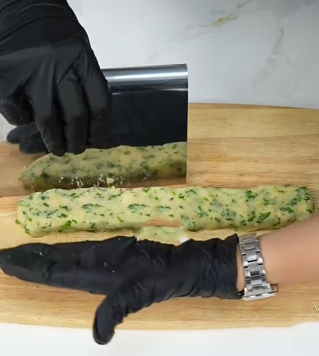 در ادامه باید سیب زمینی ها را با جعفری و ادویه ها و نشاسته ذرت خوب مخلوط کنید تا یکدست شود و یک خمیر مسنجمی بدست بیاید و بعد خمیر را به ۴ قسمت تقسیم کنید و هر قسمت را روی تخته آشپزی به صورت رولی باز کنید.