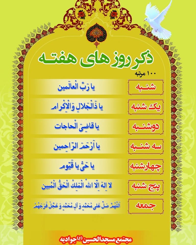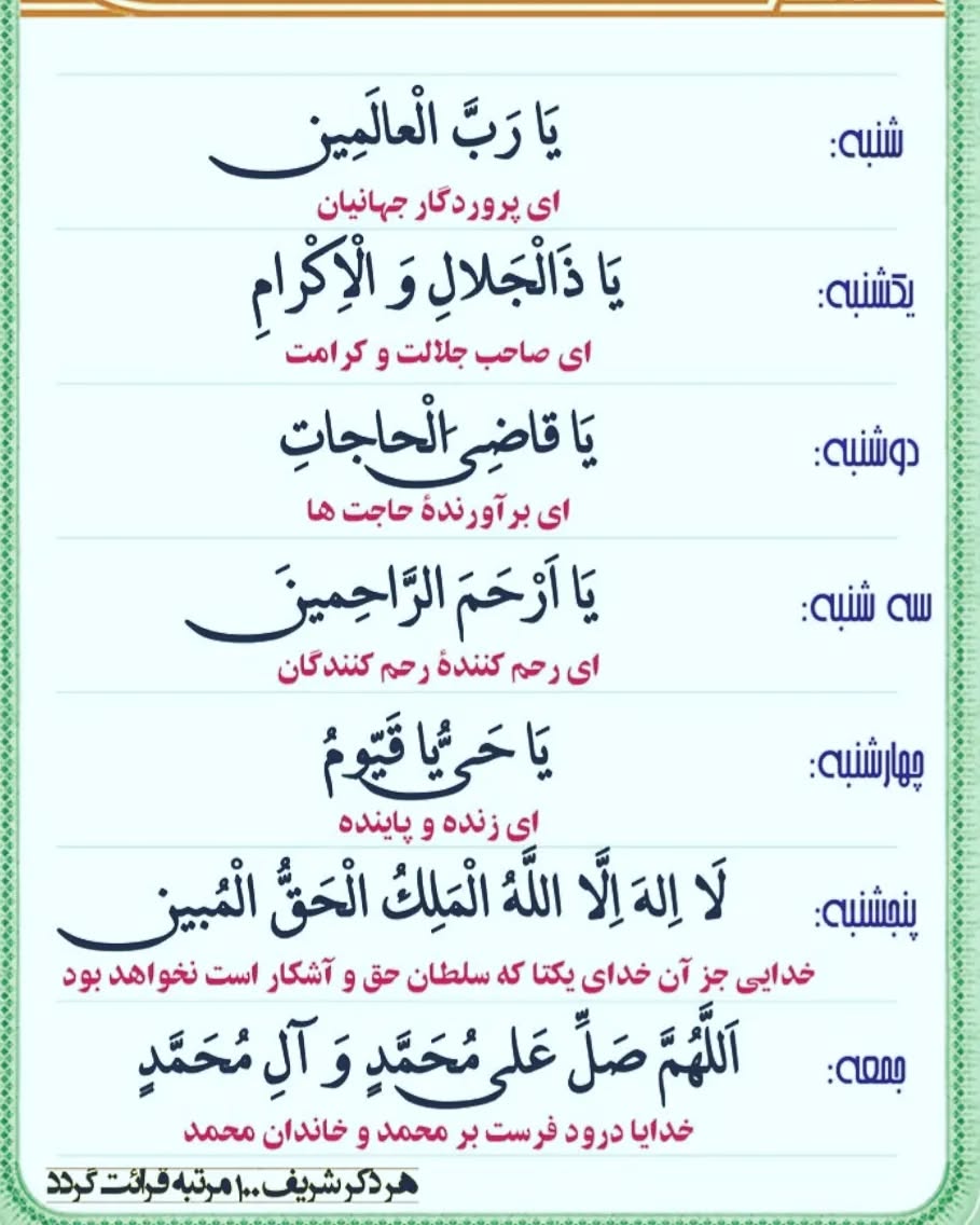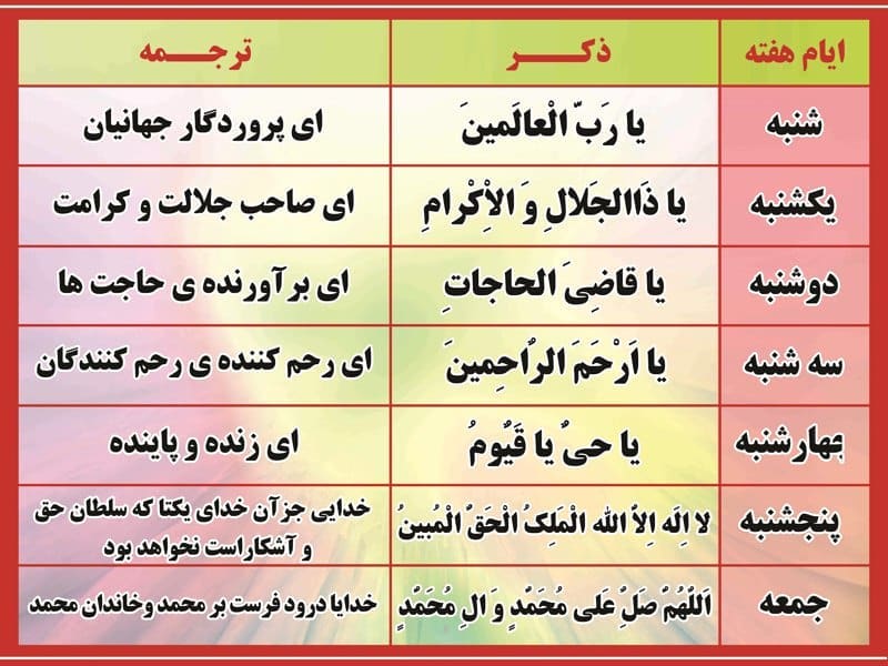 در ادامه، به معرفی ذکرهای هر روز هفته، معانی، فواید و برکات آن ها می پردازیم: