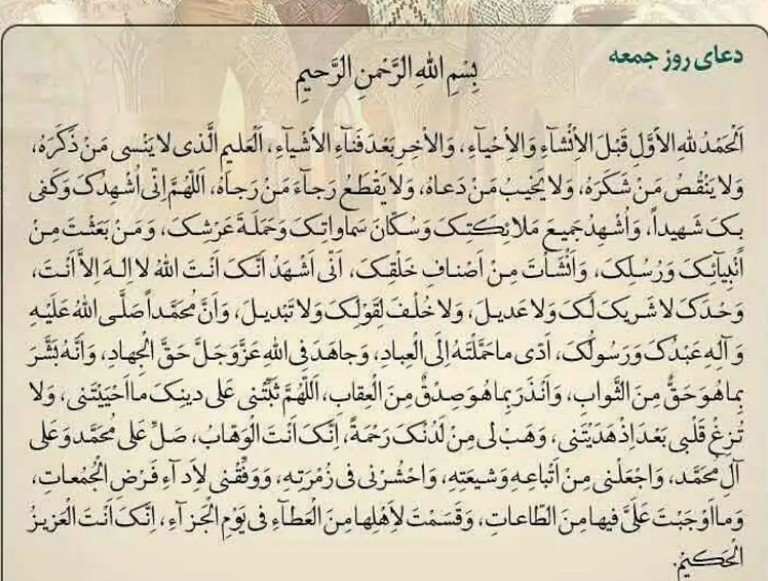 جمعه: اللّهم صَلِّ عَلَی مُحَمَّدٍ وَآلِ مُحَمَّدٍ وَعَجِّلْ فَرَجَهُمْ