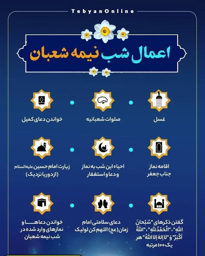 نیمه شعبان، فرصتی بی نظیر برای عبادت و نزدیکی به خداوند است. با انجام اعمال و دعاهای ویژه این شب و روز، می توان از برکات بی شمار آن بهره مند شد. توصیه می شود از این فرصت گران بها برای طلب آمرزش، برآورده شدن آرزوها، و تقرب به درگاه الهی نهایت استفاده را ببرید.