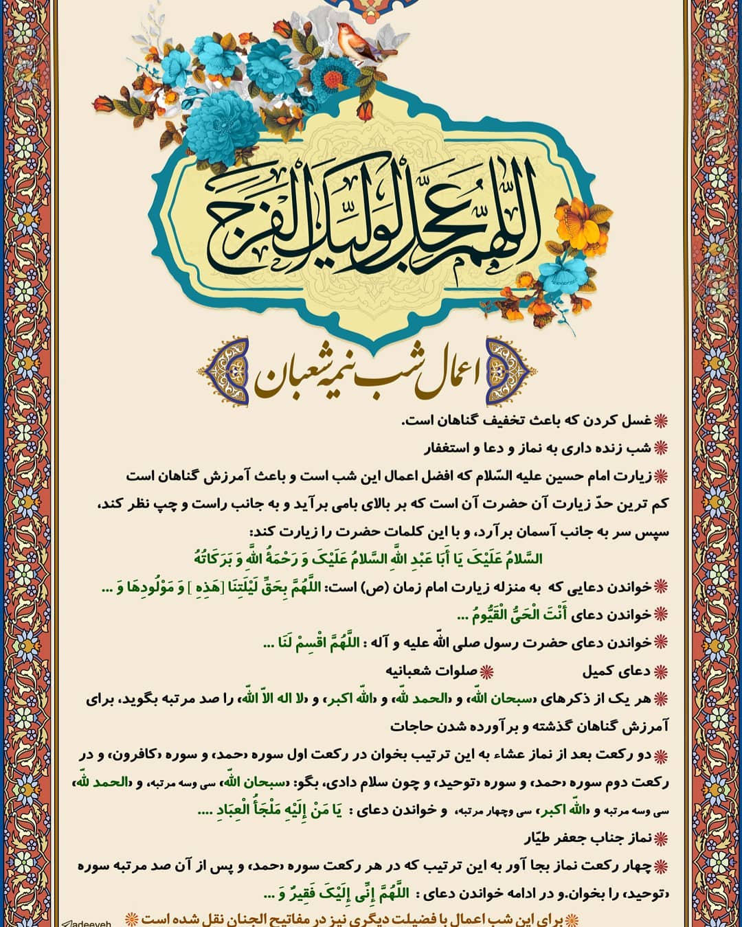 شب نیمه شعبان از بهترین شب های سال است که بعد از شب قدر، از بالاترین جایگاه برخوردار است. اعمال و عبادات این شب به شرح زیر است: