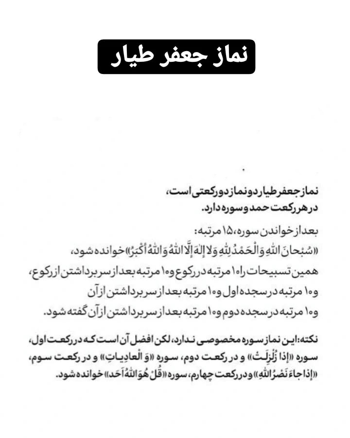 حضرت امام صادق (علیه السلام) سپس فرمودند: ای مفضّل، هرگاه به حاجت ضروری نیاز پیدا کردی، نماز جعفر را بخوان و این دعا را قرائت کن، سپس حاجت خود را از خداوند بخواه که به خواست خداوند برآورده می شود.
