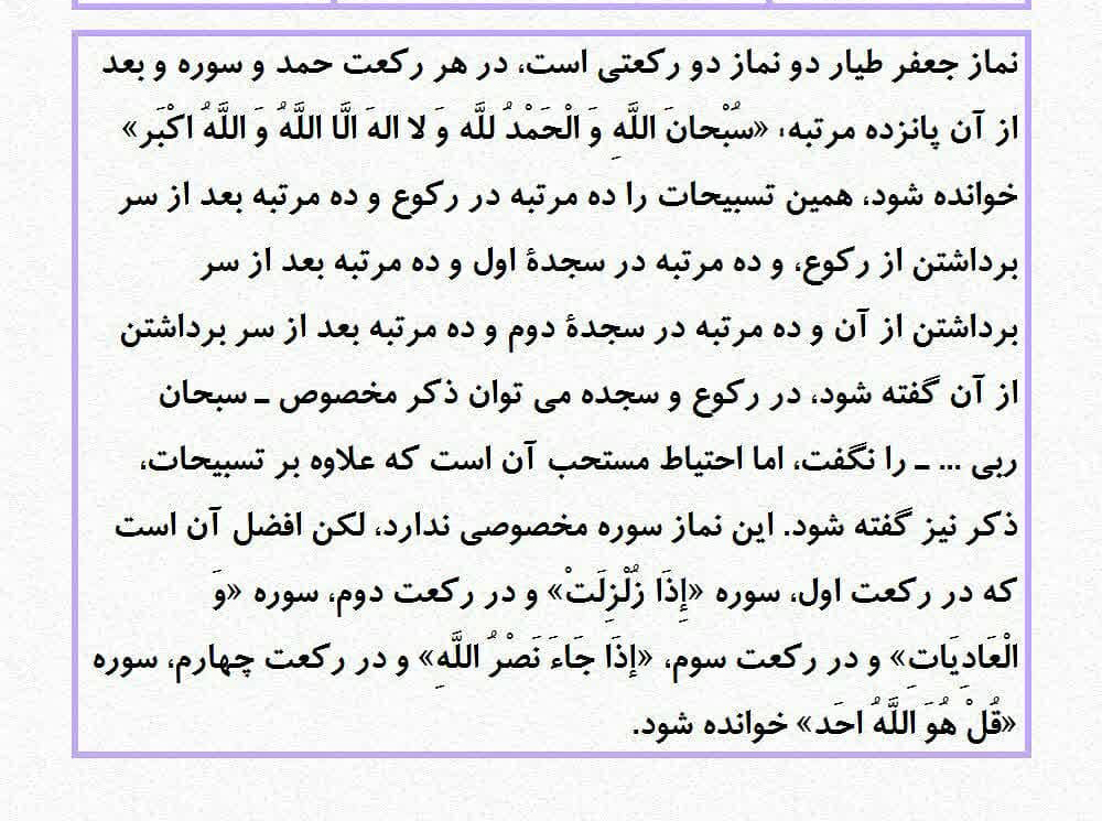 - دفع بل اها: نماز جعفر طیار به دفع بلاها و مشکلات غیر منتظره کمک می کند.