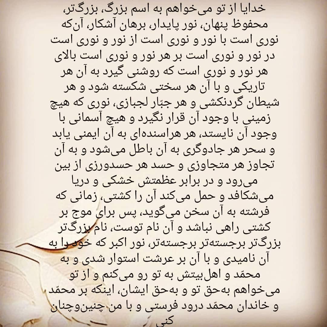 آن نامی که نور است و با نور و از نور و نور در نور است، و نور است به روی هر نوری، روشنی است بالای هر نوری، نوریست که با او هر تاریکی روشن و شکسته شود، با آن شدتی و هر شیطان سرکشی، هر جبار با عنادی که قرار نگیرد.