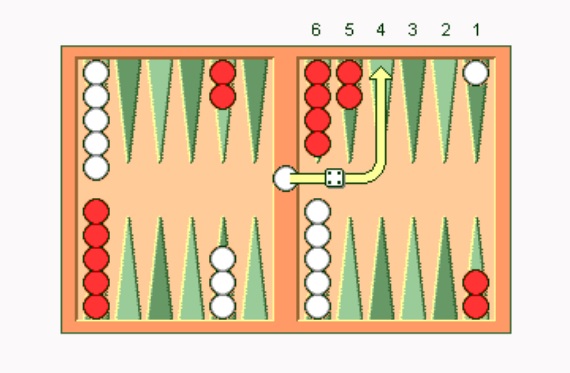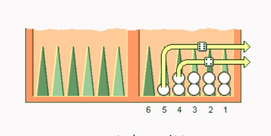 - حرکت مهره ها: مهر ه ها به تعداد اعداد روی تاس حرکت می کنند. بازیکن می تواند دو مهره را به تعداد اعداد هر تاس حرکت دهد یا یک مهره را به مجموع اعداد دو تاس.
