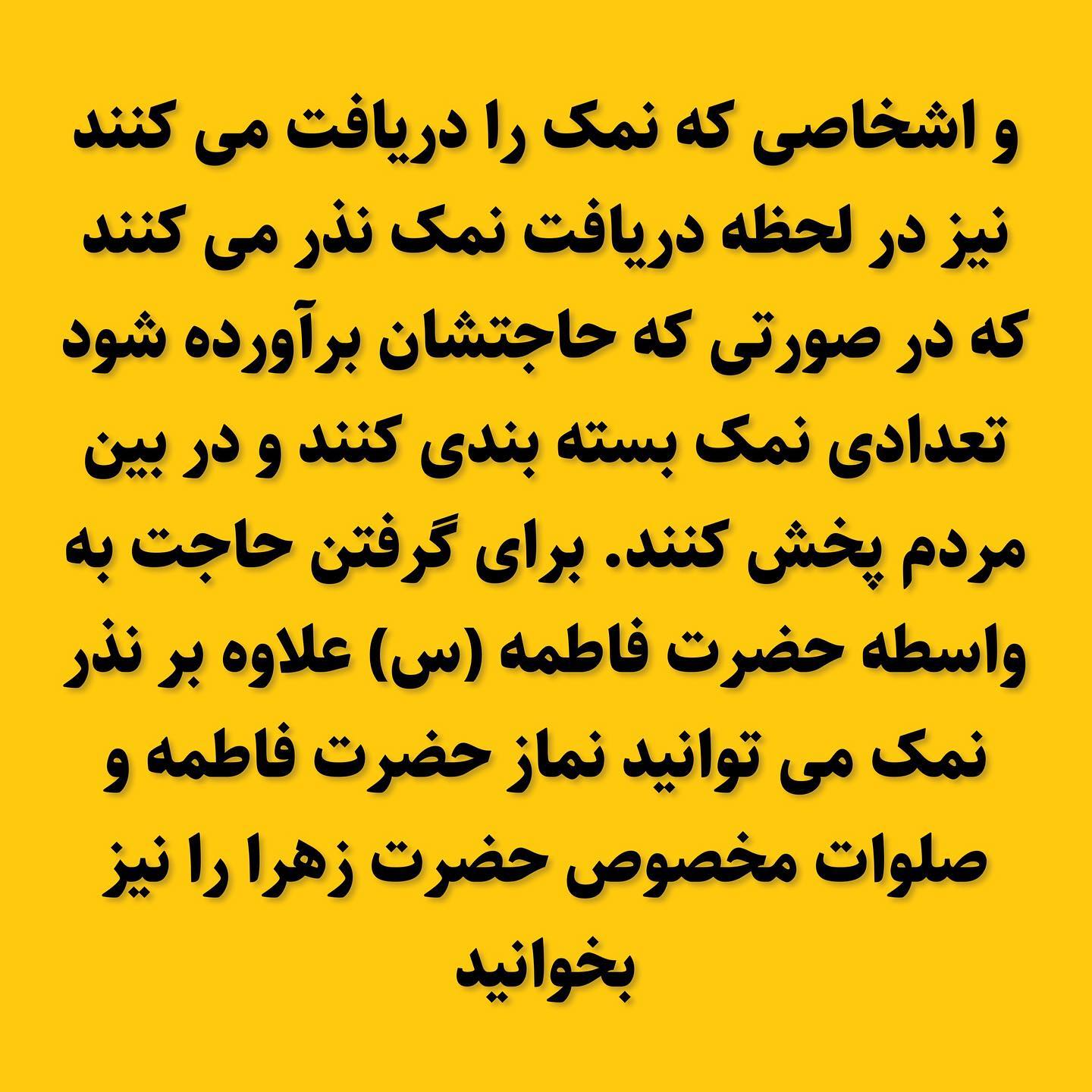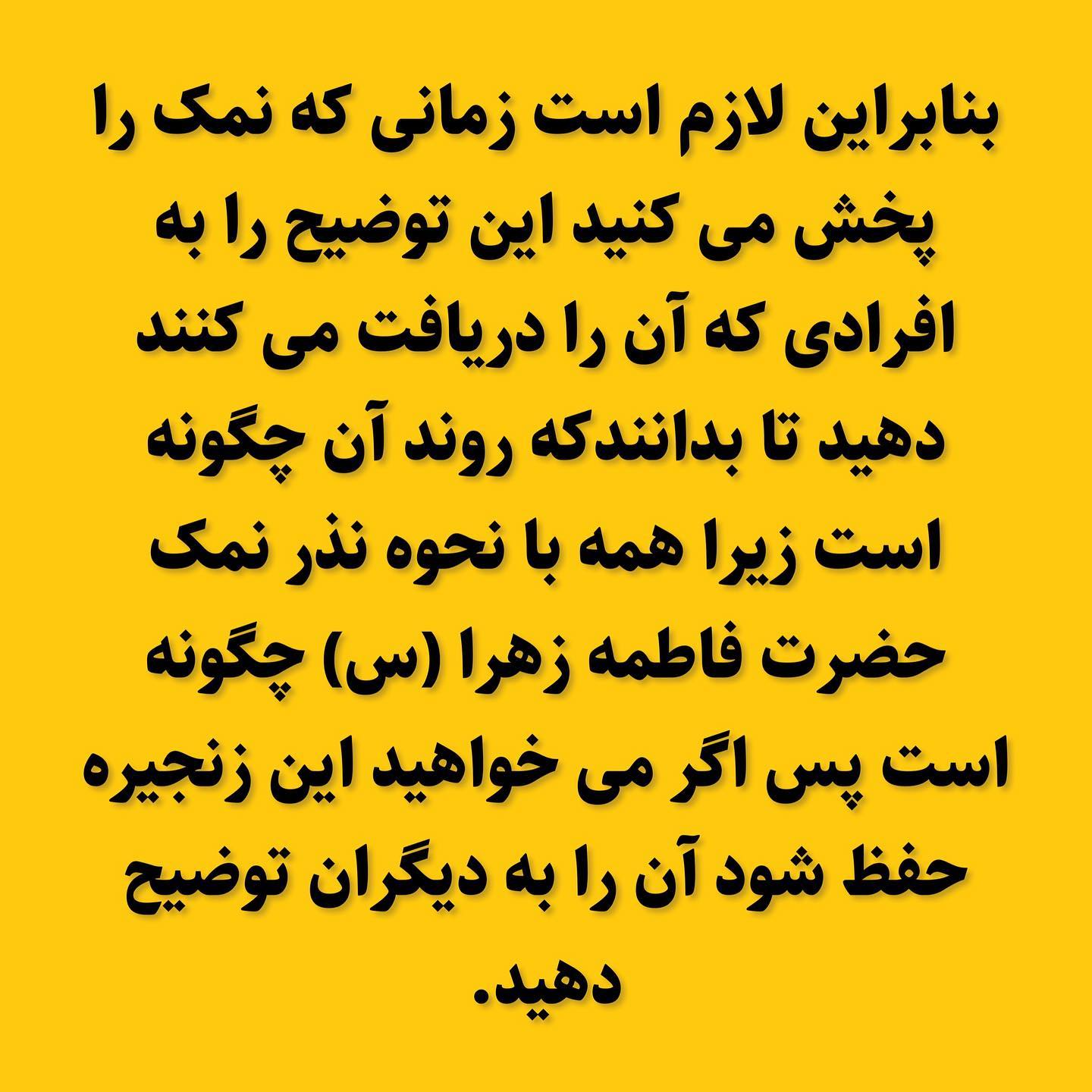 هنگام پخش نمک نذری، به افرادی که آن را دریافت می کنند، توضیح دهید: «این نمک به نیت حضرت فاطمه زهرا (س) و برای برآورده شدن حاجت نذر شده است. اگر حاجت شما برآورده شود، می توانید مقداری نمک را بسته بندی کرده و در میان دیگران پخش کنید تا این زنجیره برکت ادامه یابد. همه با این رسم آشنا نیستند، پس لطفا آن را به دیگران توضیح دهید.