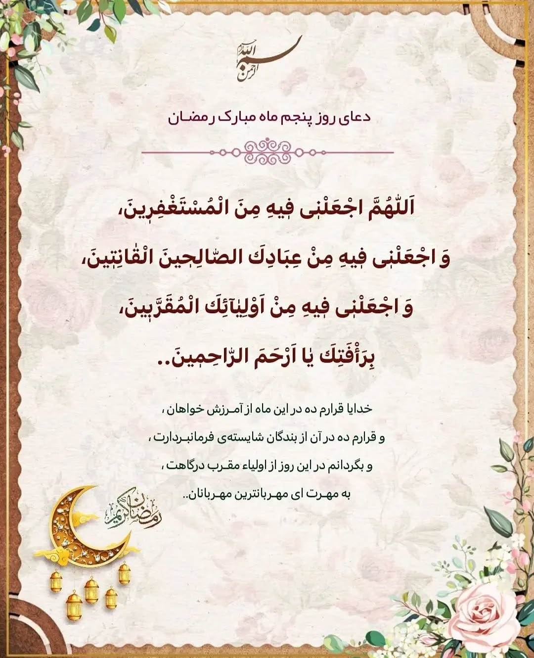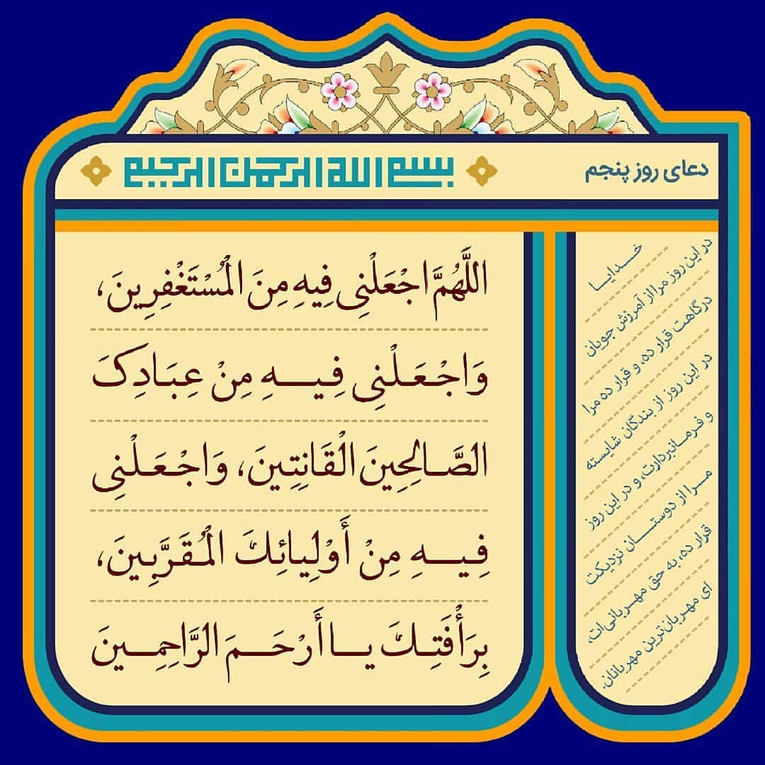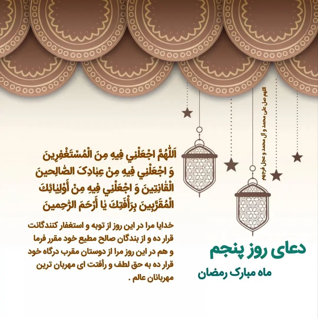ماه مبارک رمضان، ماه رحمت و مغفرت الهی است و هر روز آن با دعای مخصوصی همراه است که فضیلت خاص خود را دارد. دعای روز پنجم ماه رمضان یکی از این دعا هاست که با مضامین عمیق معنوی، از خداوند طلب آمرزش، صلاح و قرب می کند. در این مقاله، متن دعای روز پنجم را همراه با عکس مناسب برای استوری، فایل صوتی با صدای دل نشین سید قاسم موسوی قهار و شرحی کوتاه از این دعا ارائه می دهیم تا شما بتوانید از این محتوا در فضای مجازی یا برای بهره مندی معنوی استفاده کنید.