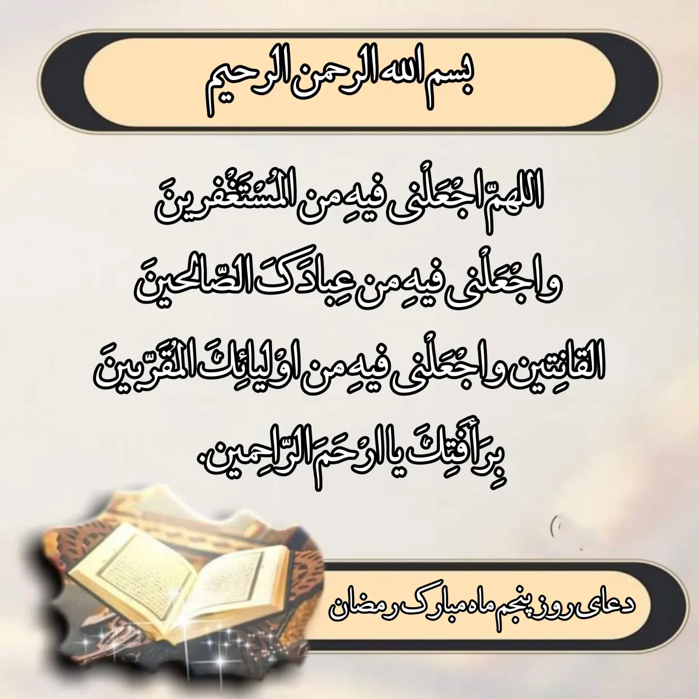 اللهمّ اجْعَلْنِی فِیهِ مِنَ المُسْتَغْفِرِینَ واجْعَلْنِی فِیهِ مِن عِبادِکَ الصّالِحِینَ القانِتِینَ واجْعَلْنِی فِیهِ مِن أوْلِیائِکَ المُقَرَّبِینَ بِرَأْفَتِکَ یا أرْحَمَ الرّاحِمِینَ
