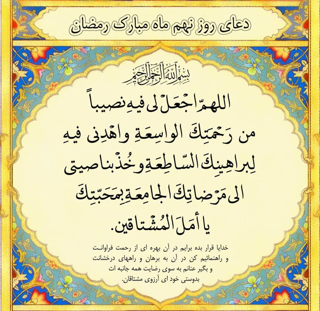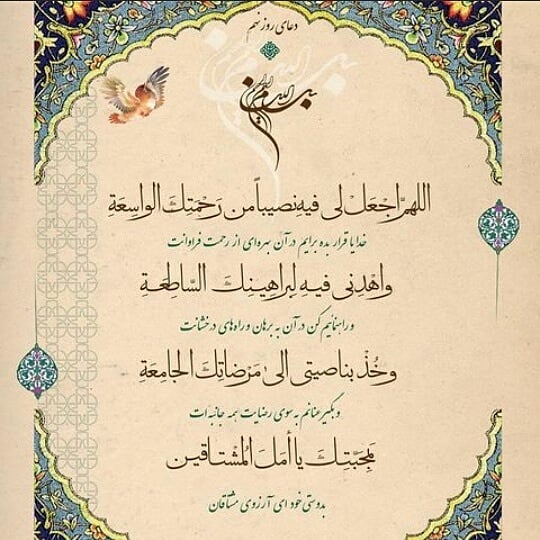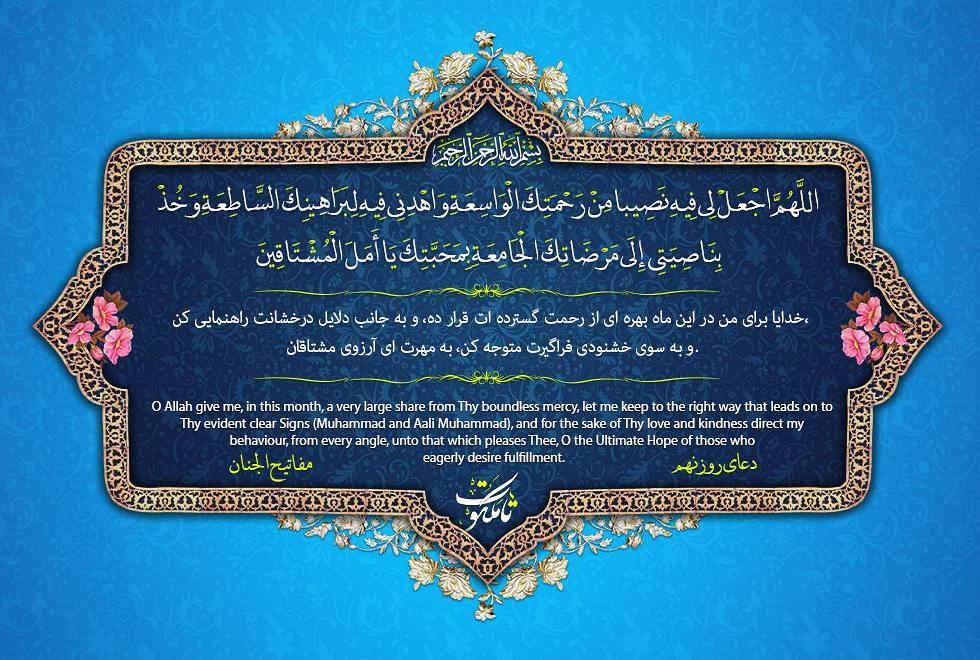 «خدایا، در این روز برای من بهره ای از رحمت گسترده ات قرار ده و مرا به سوی دلایل و برهان های درخشانت راهنمایی کن و به سوی خشنودی فراگیرت هدایتم کن، به مهر و محبتت ای آرزوی مشتاقان.»