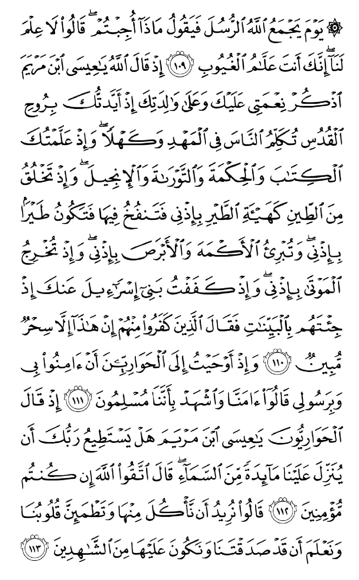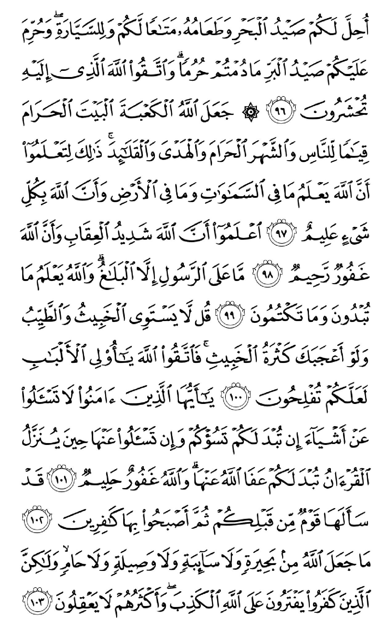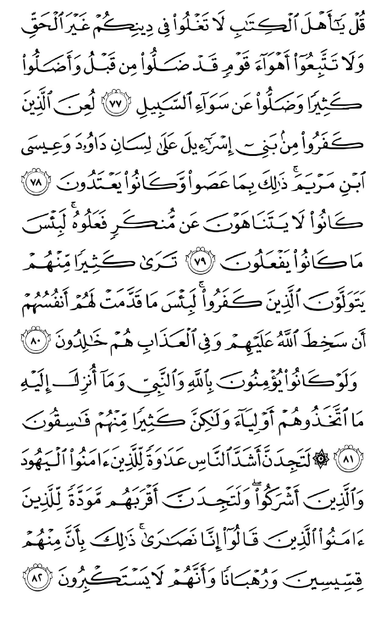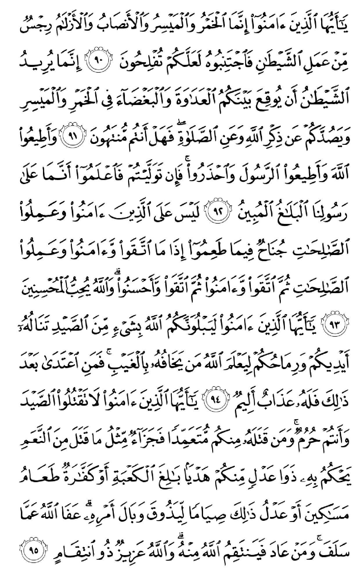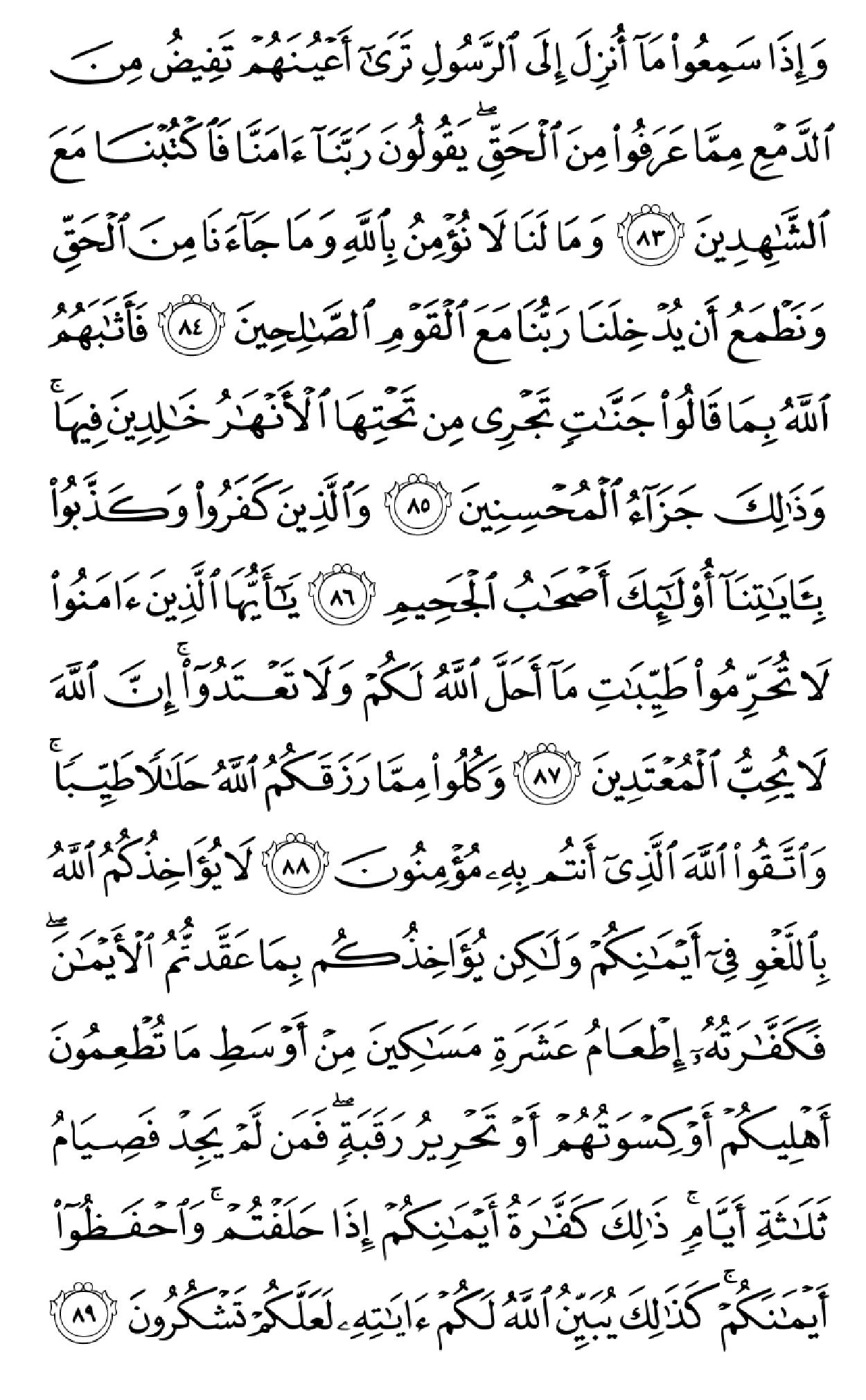 ۞لَتَجِدَنَّ أَشَدَّ ٱلنَّاسِ عَدَٰوَهٗ لِّلَّذِینَ ءَامَنُواْ ٱلۡیَهُودَ وَٱلَّذِینَ أَشۡرَکُواْۖ وَلَتَجِدَنَّ أَقۡرَبَهُم مَّوَدَّهٗ لِّلَّذِینَ ءَامَنُواْ ٱلَّذِینَ قَالُوٓاْ إِنَّا نَصَٰرَىٰۚ ذَٰلِکَ بِأَنَّ مِنۡهُمۡ قِسِّیسِینَ وَرُهۡبَانٗا وَأَنَّهُمۡ لَا یَسۡتَکۡبِرُونَ (۸۲) وَإِذَا سَمِعُواْ مَآ أُنزِلَ إِلَى ٱلرَّسُولِ تَرَىٰٓ أَعۡیُنَهُمۡ تَفِیضُ مِنَ ٱلدَّمۡعِ مِمَّا عَرَفُواْ مِنَ ٱلۡحَقِّۖ یَقُولُونَ رَبَّنَآ ءَامَنَّا فَٱکۡتُبۡنَا مَعَ ٱلشَّـٰهِدِینَ (۸۳) وَمَا لَنَا لَا نُؤۡمِنُ بِٱللَّهِ وَمَا جَآءَنَا مِنَ ٱلۡحَقِّ وَنَطۡمَعُ أَن یُدۡخِلَنَا رَبُّنَا مَعَ ٱلۡقَوۡمِ ٱلصَّـٰلِحِینَ (۸۴) فَأَثَٰبَهُمُ ٱللَّهُ بِمَا قَالُواْ جَنَّـٰتٖ تَجۡرِی مِن تَحۡتِهَا ٱلۡأَنۡهَٰرُ خَٰلِدِینَ فِیهَاۚ وَذَٰلِکَ جَزَآءُ ٱلۡمُحۡسِنِینَ (۸۵) وَٱلَّذِینَ کَفَرُواْ وَکَذَّبُواْ بِـَٔایَٰتِنَآ أُوْلَـٰٓئِکَ أَصۡحَٰبُ ٱلۡجَحِیمِ (۸۶) یَـٰٓأَیُّهَا ٱلَّذِینَ ءَامَنُواْ لَا تُحَرِّمُواْ طَیِّبَٰتِ مَآ أَحَلَّ ٱللَّهُ لَکُمۡ وَلَا تَعۡتَدُوٓاْۚ إِنَّ ٱللَّهَ لَا یُحِبُّ ٱلۡمُعۡتَدِینَ (۸۷) وَکُلُواْ مِمَّا رَزَقَکُمُ ٱللَّهُ حَلَٰلٗا طَیِّبٗاۚ وَٱتَّقُواْ ٱللَّهَ ٱلَّذِیٓ أَنتُم بِهِۦ مُؤۡمِنُونَ (۸۸) لَا یُؤَاخِذُکُمُ ٱللَّهُ بِٱللَّغۡوِ فِیٓ أَیۡمَٰنِکُمۡ وَلَٰکِن یُؤَاخِذُکُم بِمَا عَقَّدتُّمُ ٱلۡأَیۡمَٰنَۖ فَکَفَّـٰرَتُهُۥٓ إِطۡعَامُ عَشَرَهِ مَسَٰکِینَ مِنۡ أَوۡسَطِ مَا تُطۡعِمُونَ أَهۡلِیکُمۡ أَوۡ کِسۡوَتُهُمۡ أَوۡ تَحۡرِیرُ رَقَبَهٖۖ فَمَن لَّمۡ یَجِدۡ فَصِیَامُ ثَلَٰثَهِ أَیَّامٖۚ ذَٰلِکَ کَفَّـٰرَهُ أَیۡمَٰنِکُمۡ إِذَا حَلَفۡتُمۡۚ وَٱحۡفَظُوٓاْ أَیۡمَٰنَکُمۡۚ کَذَٰلِکَ یُبَیِّنُ ٱللَّهُ لَکُمۡ ءَایَٰتِهِۦ لَعَلَّکُمۡ تَشۡکُرُونَ (۸۹) یَـٰٓأَیُّهَا ٱلَّذِینَ ءَامَنُوٓاْ إِنَّمَا ٱلۡخَمۡرُ وَٱلۡمَیۡسِرُ وَٱلۡأَنصَابُ وَٱلۡأَزۡلَٰمُ رِجۡسٞ مِّنۡ عَمَلِ ٱلشَّیۡطَٰنِ فَٱجۡتَنِبُوهُ لَعَلَّکُمۡ تُفۡلِحُونَ (۹۰) إِنَّمَا یُرِیدُ ٱلشَّیۡطَٰنُ أَن یُوقِعَ بَیۡنَکُمُ ٱلۡعَدَٰوَهَ وَٱلۡبَغۡضَآءَ فِی ٱلۡخَمۡرِ وَٱلۡمَیۡسِرِ وَیَصُدَّکُمۡ عَن ذِکۡرِ ٱللَّهِ وَعَنِ ٱلصَّلَوٰهِۖ فَهَلۡ أَنتُم مُّنتَهُونَ (۹۱) وَأَطِیعُواْ ٱللَّهَ وَأَطِیعُواْ ٱلرَّسُولَ وَٱحۡذَرُواْۚ فَإِن تَوَلَّیۡتُمۡ فَٱعۡلَمُوٓاْ أَنَّمَا عَلَىٰ رَسُولِنَا ٱلۡبَلَٰغُ ٱلۡمُبِینُ (۹۲) لَیۡسَ عَلَى ٱلَّذِینَ ءَامَنُواْ وَعَمِلُواْ ٱلصَّـٰلِحَٰتِ جُنَاحٞ فِیمَا طَعِمُوٓاْ إِذَا مَا ٱتَّقَواْ وَّءَامَنُواْ وَعَمِلُواْ ٱلصَّـٰلِحَٰتِ ثُمَّ ٱتَّقَواْ وَّءَامَنُواْ ثُمَّ ٱتَّقَواْ وَّأَحۡسَنُواْۚ وَٱللَّهُ یُحِبُّ ٱلۡمُحۡسِنِینَ (۹۳) یَـٰٓأَیُّهَا ٱلَّذِینَ ءَامَنُواْ لَیَبۡلُوَنَّکُمُ ٱللَّهُ بِشَیۡءٖ مِّنَ ٱلصَّیۡدِ تَنَالُهُۥٓ أَیۡدِیکُمۡ وَرِمَاحُکُمۡ لِیَعۡلَمَ ٱللَّهُ مَن یَخَافُهُۥ بِٱلۡغَیۡبِۚ فَمَنِ ٱعۡتَدَىٰ بَعۡدَ ذَٰلِکَ فَلَهُۥ عَذَابٌ أَلِیمٞ (۹۴) یَـٰٓأَیُّهَا ٱلَّذِینَ ءَامَنُواْ لَا تَقۡتُلُواْ ٱلصَّیۡدَ وَأَنتُمۡ حُرُمٞۚ وَمَن قَتَلَهُۥ مِنکُم مُّتَعَمِّدٗا فَجَزَآءٞ مِّثۡلُ مَا قَتَلَ مِنَ ٱلنَّعَمِ یَحۡکُمُ بِهِۦ ذَوَا عَدۡلٖ مِّنکُمۡ هَدۡیَۢا بَٰلِغَ ٱلۡکَعۡبَهِ أَوۡ کَفَّـٰرَهٞ طَعَامُ مَسَٰکِینَ أَوۡ عَدۡلُ ذَٰلِکَ صِیَامٗا لِّیَذُوقَ وَبَالَ أَمۡرِهِۦۗ عَفَا ٱللَّهُ عَمَّا سَلَفَۚ وَمَنۡ عَادَ فَیَنتَقِمُ ٱللَّهُ مِنۡهُۚ وَٱللَّهُ عَزِیزٞ ذُو ٱنتِقَامٍ (۹۵) أُحِلَّ لَکُمۡ صَیۡدُ ٱلۡبَحۡرِ وَطَعَامُهُۥ مَتَٰعٗا لَّکُمۡ وَلِلسَّیَّارَهِۖ وَحُرِّمَ عَلَیۡکُمۡ صَیۡدُ ٱلۡبَرِّ مَا دُمۡتُمۡ حُرُمٗاۗ وَٱتَّقُواْ ٱللَّهَ ٱلَّذِیٓ إِلَیۡهِ تُحۡشَرُونَ (۹۶) ۞جَعَلَ 