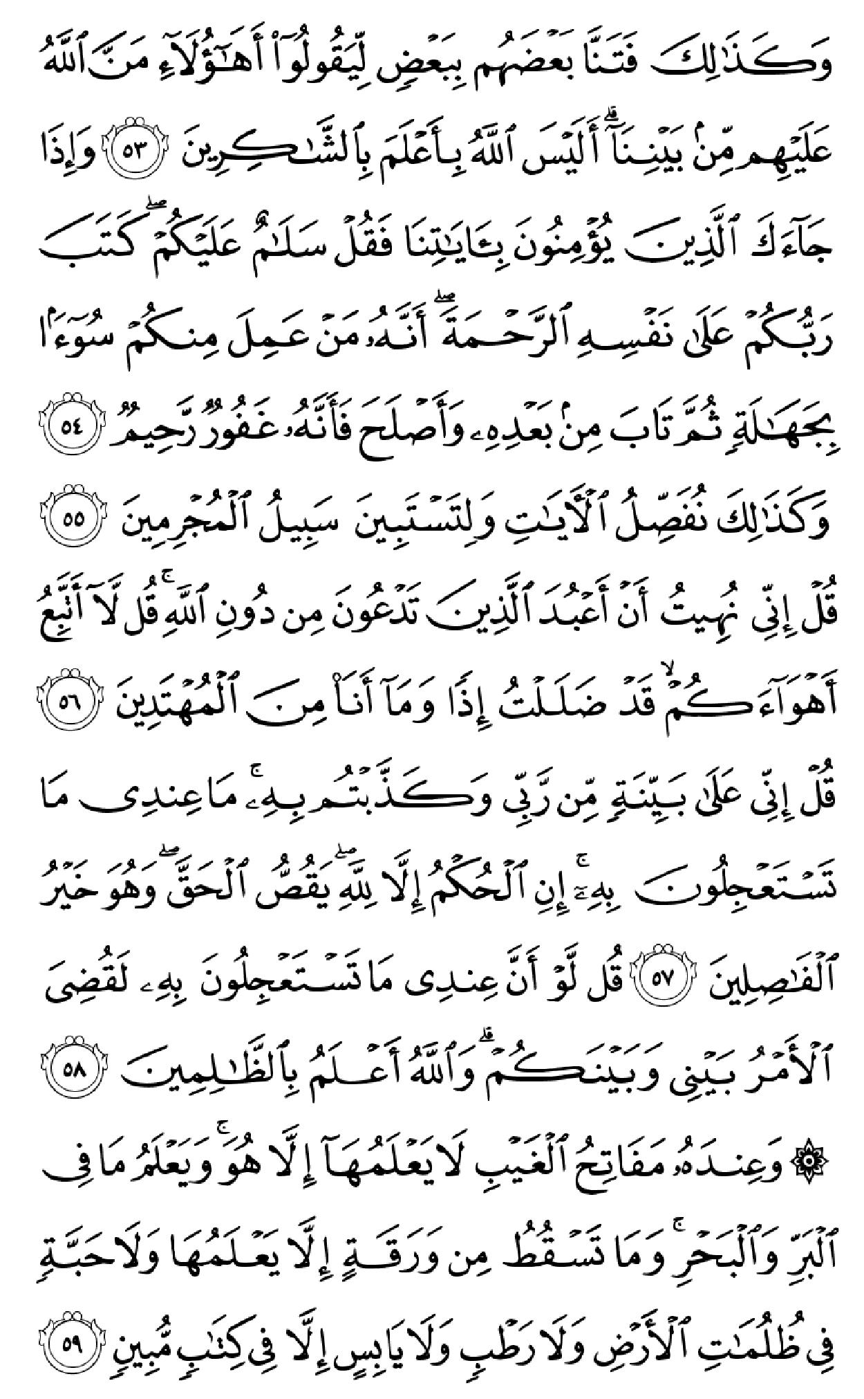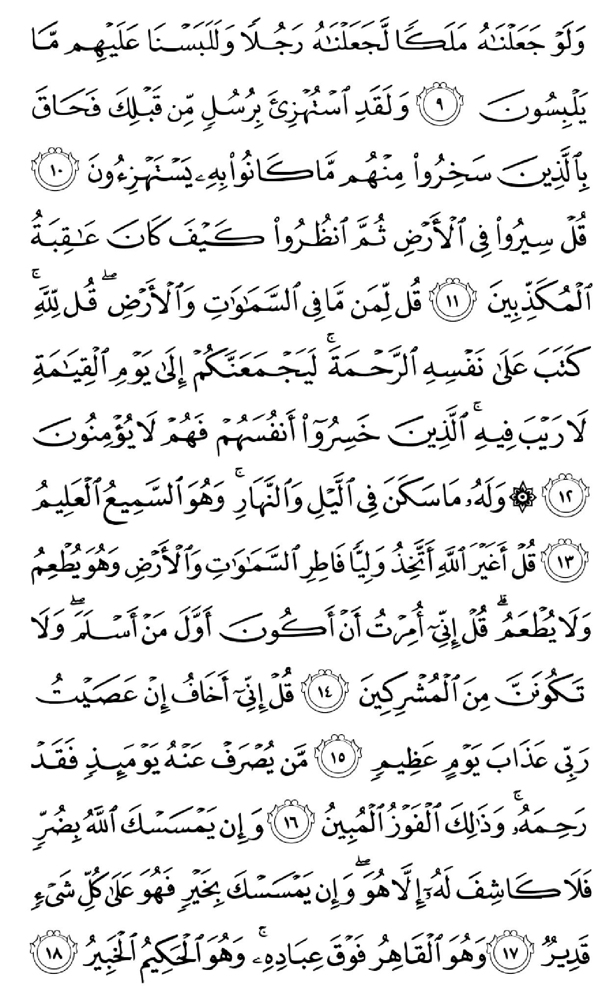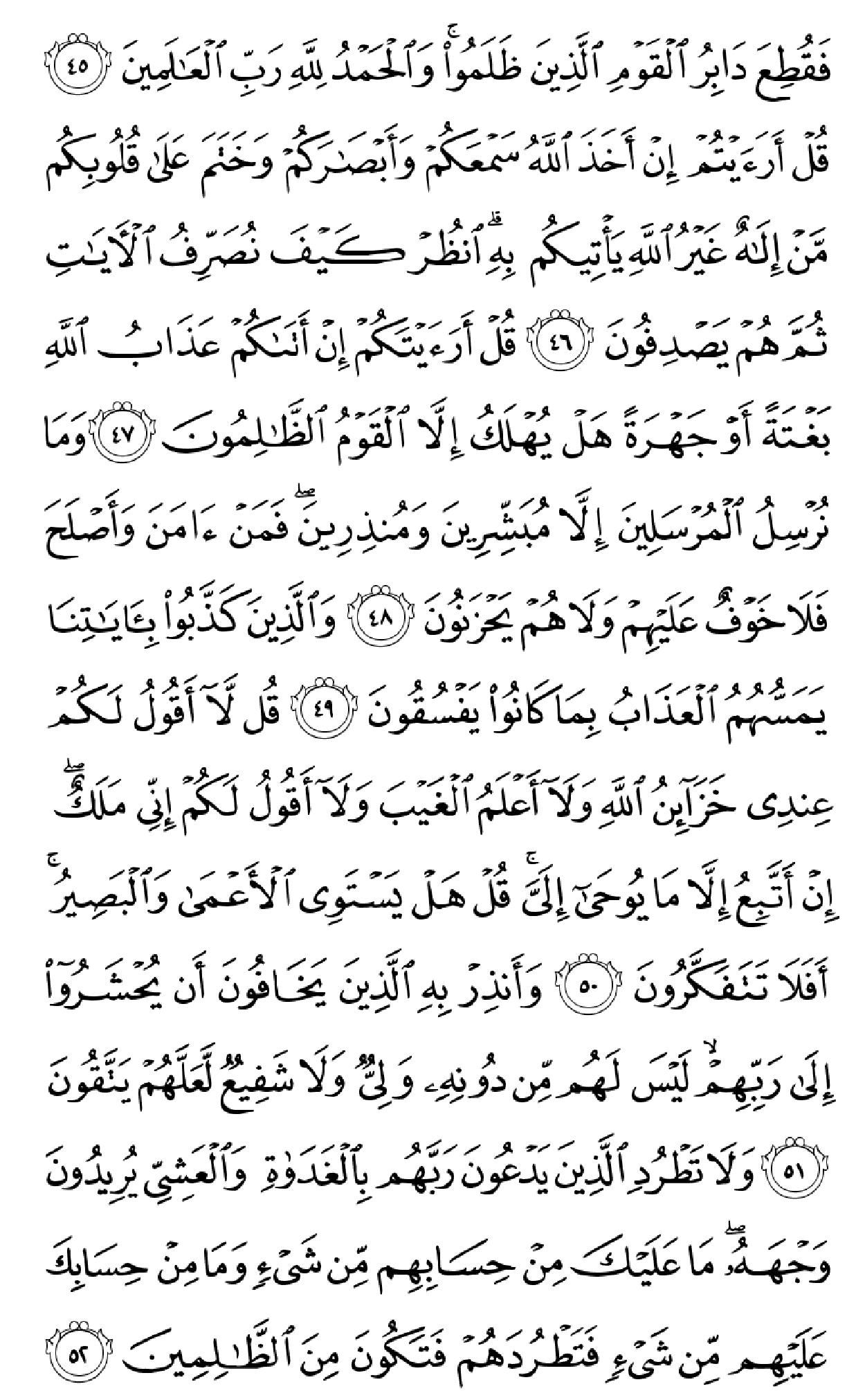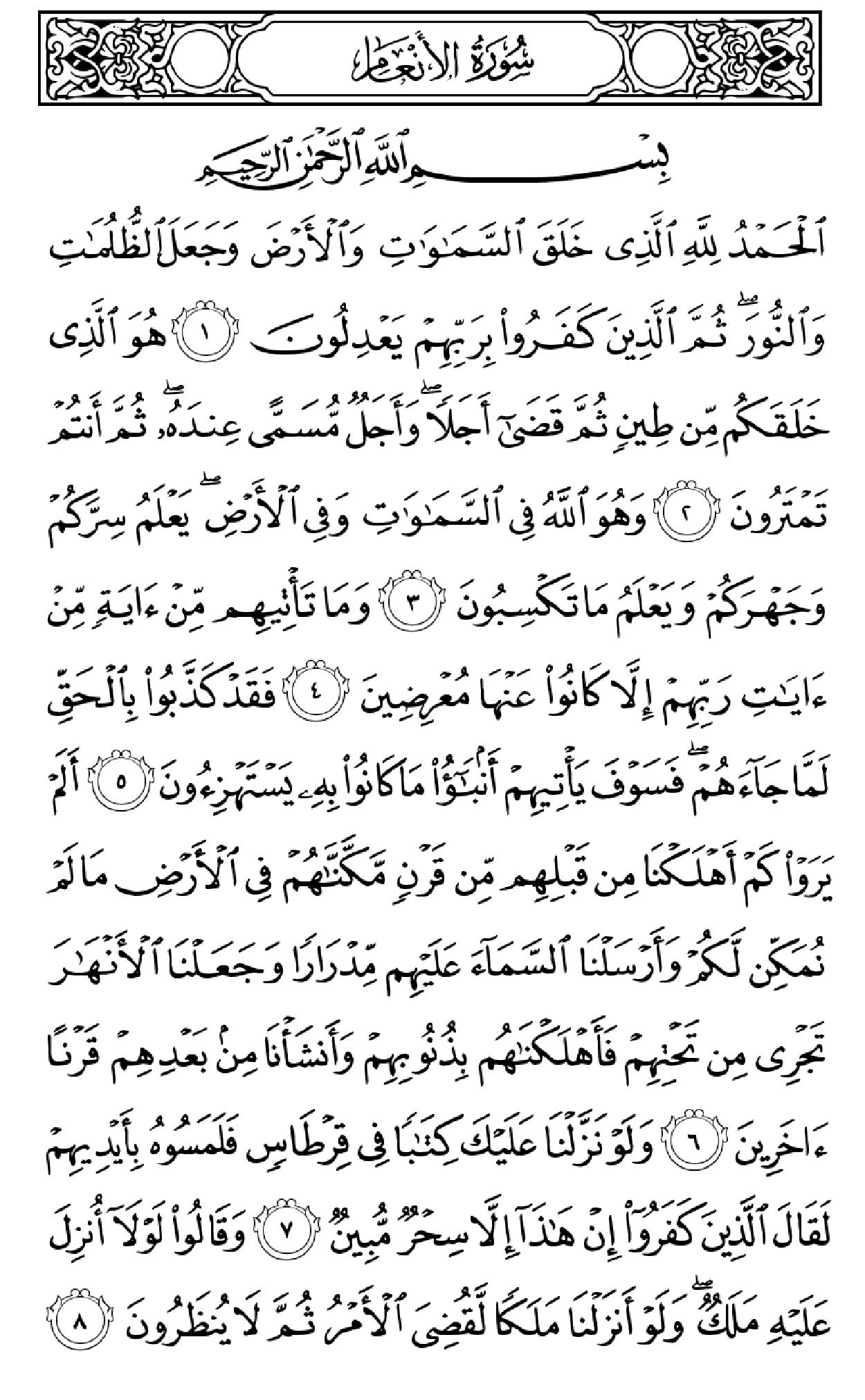 ٱلۡحَمۡدُ لِلَّهِ ٱلَّذِی خَلَقَ ٱلسَّمَٰوَٰتِ وَٱلۡأَرۡضَ وَجَعَلَ ٱلظُّلُمَٰتِ وَٱلنُّورَۖ ثُمَّ ٱلَّذِینَ کَفَرُواْ بِرَبِّهِمۡ یَعۡدِلُونَ (۱) هُوَ ٱلَّذِی خَلَقَکُم مِّن طِینٖ ثُمَّ قَضَىٰٓ أَجَلٗاۖ وَأَجَلٞ مُّسَمًّى عِندَهُۥۖ ثُمَّ أَنتُمۡ تَمۡتَرُونَ (۲) وَهُوَ ٱللَّهُ فِی ٱلسَّمَٰوَٰتِ وَفِی ٱلۡأَرۡضِ یَعۡلَمُ سِرَّکُمۡ وَجَهۡرَکُمۡ وَیَعۡلَمُ مَا تَکۡسِبُونَ (۳) وَمَا تَأۡتِیهِم مِّنۡ ءَایَهٖ مِّنۡ ءَایَٰتِ رَبِّهِمۡ إِلَّا کَانُواْ عَنۡهَا مُعۡرِضِینَ (۴) فَقَدۡ کَذَّبُواْ بِٱلۡحَقِّ لَمَّا جَآءَهُمۡ فَسَوۡفَ یَأۡتِیهِمۡ أَنۢبَـٰٓؤُاْ مَا کَانُواْ بِهِۦ یَسۡتَهۡزِءُونَ (۵) أَلَمۡ یَرَوۡاْ کَمۡ أَهۡلَکۡنَا مِن قَبۡلِهِم مِّن قَرۡنٖ مَّکَّنَّـٰهُمۡ فِی ٱلۡأَرۡضِ مَا لَمۡ نُمَکِّن لَّکُمۡ وَأَرۡسَلۡنَا ٱلسَّمَآءَ عَلَیۡهِم مِّدۡرَارٗا وَجَعَلۡنَا ٱلۡأَنۡهَٰرَ تَجۡرِی مِن تَحۡتِهِمۡ فَأَهۡلَکۡنَٰهُم بِذُنُوبِهِمۡ وَأَنشَأۡنَا مِنۢ بَعۡدِهِمۡ قَرۡنًا ءَاخَرِینَ (۶) وَلَوۡ نَزَّلۡنَا عَلَیۡکَ کِتَٰبٗا فِی قِرۡطَاسٖ فَلَمَسُوهُ بِأَیۡدِیهِمۡ لَقَالَ ٱلَّذِینَ کَفَرُوٓاْ إِنۡ هَٰذَآ إِلَّا سِحۡرٞ مُّبِینٞ (۷) وَقَالُواْ لَوۡلَآ أُنزِلَ عَلَیۡهِ مَلَکٞۖ وَلَوۡ أَنزَلۡنَا مَلَکٗا لَّقُضِیَ ٱلۡأَمۡرُ ثُمَّ لَا یُنظَرُونَ (۸) وَلَوۡ جَعَلۡنَٰهُ مَلَکٗا لَّجَعَلۡنَٰهُ رَجُلٗا وَلَلَبَسۡنَا عَلَیۡهِم مَّا یَلۡبِسُونَ (۹) وَلَقَدِ ٱسۡتُهۡزِئَ بِرُسُلٖ مِّن قَبۡلِکَ فَحَاقَ بِٱلَّذِینَ سَخِرُواْ مِنۡهُم مَّا کَانُواْ بِهِۦ یَسۡتَهۡزِءُونَ (۱۰) قُلۡ سِیرُواْ فِی ٱلۡأَرۡضِ ثُمَّ ٱنظُرُواْ کَیۡفَ کَانَ عَٰقِبَهُ ٱلۡمُکَذِّبِینَ (۱۱) قُل لِّمَن مَّا فِی ٱلسَّمَٰوَٰتِ وَٱلۡأَرۡضِۖ قُل لِّلَّهِۚ کَتَبَ عَلَىٰ نَفۡسِهِ ٱلرَّحۡمَهَۚ لَیَجۡمَعَنَّکُمۡ إِلَىٰ یَوۡمِ ٱلۡقِیَٰمَهِ لَا رَیۡبَ فِیهِۚ ٱلَّذِینَ خَسِرُوٓاْ أَنفُسَهُمۡ فَهُمۡ لَا یُؤۡمِنُونَ (۱۲) ۞وَلَهُۥ مَا سَکَنَ فِی ٱلَّیۡلِ وَٱلنَّهَارِۚ وَهُوَ ٱلسَّمِیعُ ٱلۡعَلِیمُ (۱۳) قُلۡ أَغَیۡرَ ٱللَّهِ أَتَّخِذُ وَلِیّٗا فَاطِرِ ٱلسَّمَٰوَٰتِ وَٱلۡأَرۡضِ وَهُوَ یُطۡعِمُ وَلَا یُطۡعَمُۗ قُلۡ إِنِّیٓ أُمِرۡتُ أَنۡ أَکُونَ أَوَّلَ مَنۡ أَسۡلَمَۖ وَلَا تَکُونَنَّ مِنَ ٱلۡمُشۡرِکِینَ (۱۴) قُلۡ إِنِّیٓ أَخَافُ إِنۡ عَصَیۡتُ رَبِّی عَذَابَ یَوۡمٍ عَظِیمٖ (۱۵) مَّن یُصۡرَفۡ عَنۡهُ یَوۡمَئِذٖ فَقَدۡ رَحِمَهُۥۚ وَذَٰلِکَ ٱلۡفَوۡزُ ٱلۡمُبِینُ (۱۶) وَإِن یَمۡسَسۡکَ ٱللَّهُ بِضُرّٖ فَلَا کَاشِفَ لَهُۥٓ إِلَّا هُوَۖ وَإِن یَمۡسَسۡکَ بِخَیۡرٖ فَهُوَ عَلَىٰ کُلِّ شَیۡءٖ قَدِیرٞ (۱۷) وَهُوَ ٱلۡقَاهِرُ فَوۡقَ عِبَادِهِۦۚ وَهُوَ ٱلۡحَکِیمُ ٱلۡخَبِیرُ (۱۸) قُلۡ أَیُّ شَیۡءٍ أَکۡبَرُ شَهَٰدَهٗۖ قُلِ ٱللَّهُۖ شَهِیدُۢ بَیۡنِی وَبَیۡنَکُمۡۚ وَأُوحِیَ إِلَیَّ هَٰذَا ٱلۡقُرۡءَانُ لِأُنذِرَکُم بِهِۦ وَمَنۢ بَلَغَۚ أَئِنَّکُمۡ لَتَشۡهَدُونَ أَنَّ مَعَ ٱللَّهِ ءَالِهَهً أُخۡرَىٰۚ قُل لَّآ أَشۡهَدُۚ قُلۡ إِنَّمَا هُوَ إِلَٰهٞ وَٰحِدٞ وَإِنَّنِی بَرِیٓءٞ مِّمَّا تُشۡرِکُونَ (۱۹) ٱلَّذِینَ ءَاتَیۡنَٰهُمُ ٱلۡکِتَٰبَ یَعۡرِفُونَهُۥ کَمَا یَعۡرِفُونَ أَبۡنَآءَهُمُۘ ٱلَّذِینَ خَسِرُوٓاْ أَنفُسَهُمۡ فَهُمۡ لَا یُؤۡمِنُونَ (۲۰) وَمَنۡ أَظۡلَمُ مِمَّنِ ٱفۡتَرَىٰ عَلَى ٱللَّهِ کَذِبًا أَوۡ کَذَّبَ بِـَٔایَٰتِهِۦٓۚ إِنَّهُۥ لَا یُفۡلِحُ ٱلظَّـٰلِمُونَ (۲۱) وَیَوۡمَ نَحۡشُرُهُمۡ جَمِیعٗا ثُمَّ نَقُولُ لِلَّذِینَ أَشۡرَکُوٓاْ أَیۡنَ شُرَکَآؤُکُمُ ٱلَّذِینَ کُنتُمۡ تَزۡعُمُونَ (۲۲) ثُمَّ لَمۡ تَکُن فِتۡنَتُهُمۡ إِلَّآ أَن قَالُواْ وَٱللَّهِ رَبِّنَا مَا کُنَّا مُشۡرِکِینَ (۲۳) ٱنظُرۡ کَیۡفَ کَذَبُواْ عَلَىٰٓ أَنفُسِهِمۡۚ وَضَلَّ عَنۡهُم مَّا کَانُواْ یَف