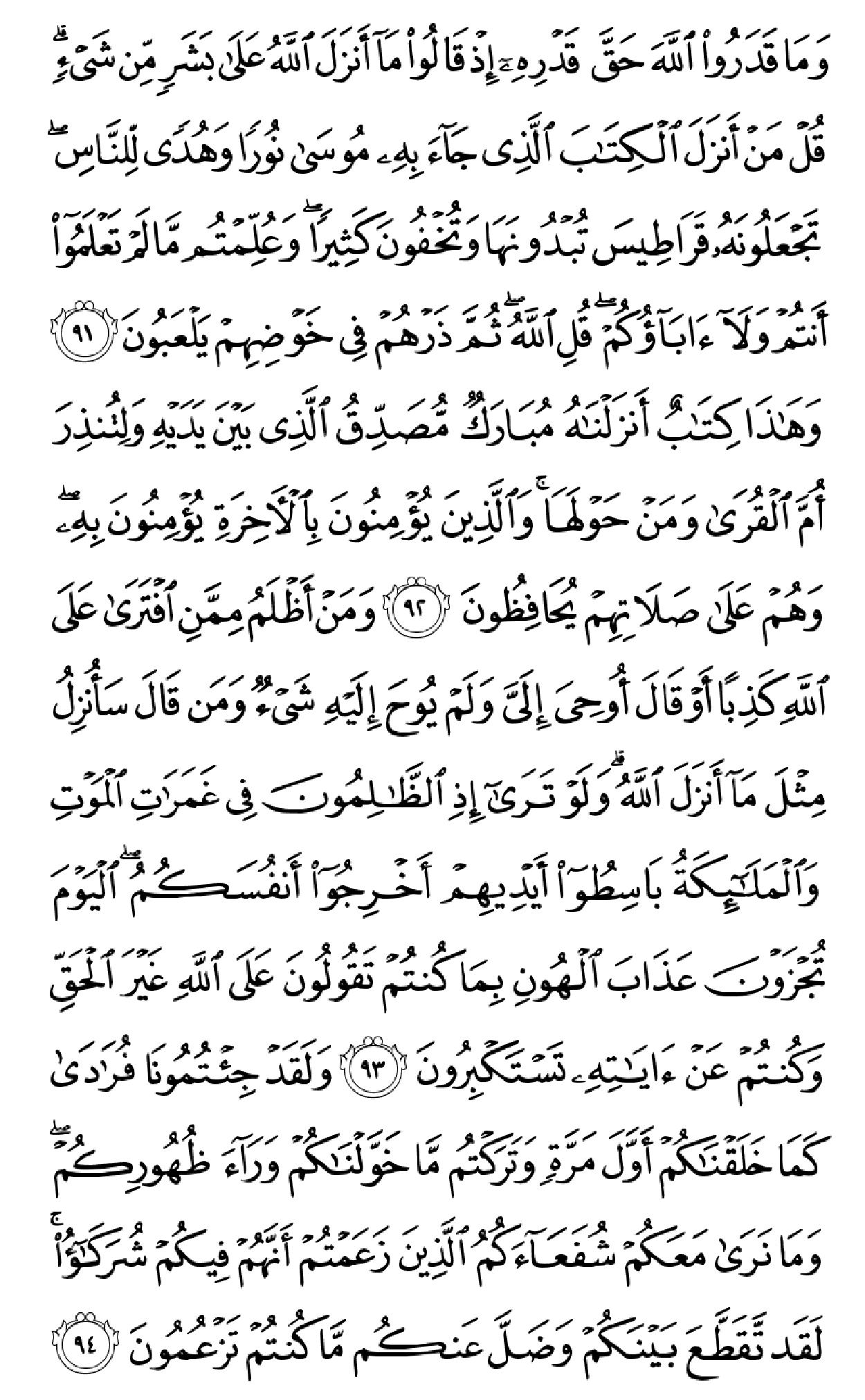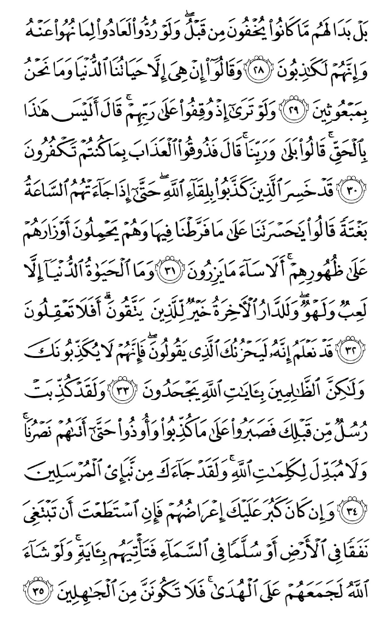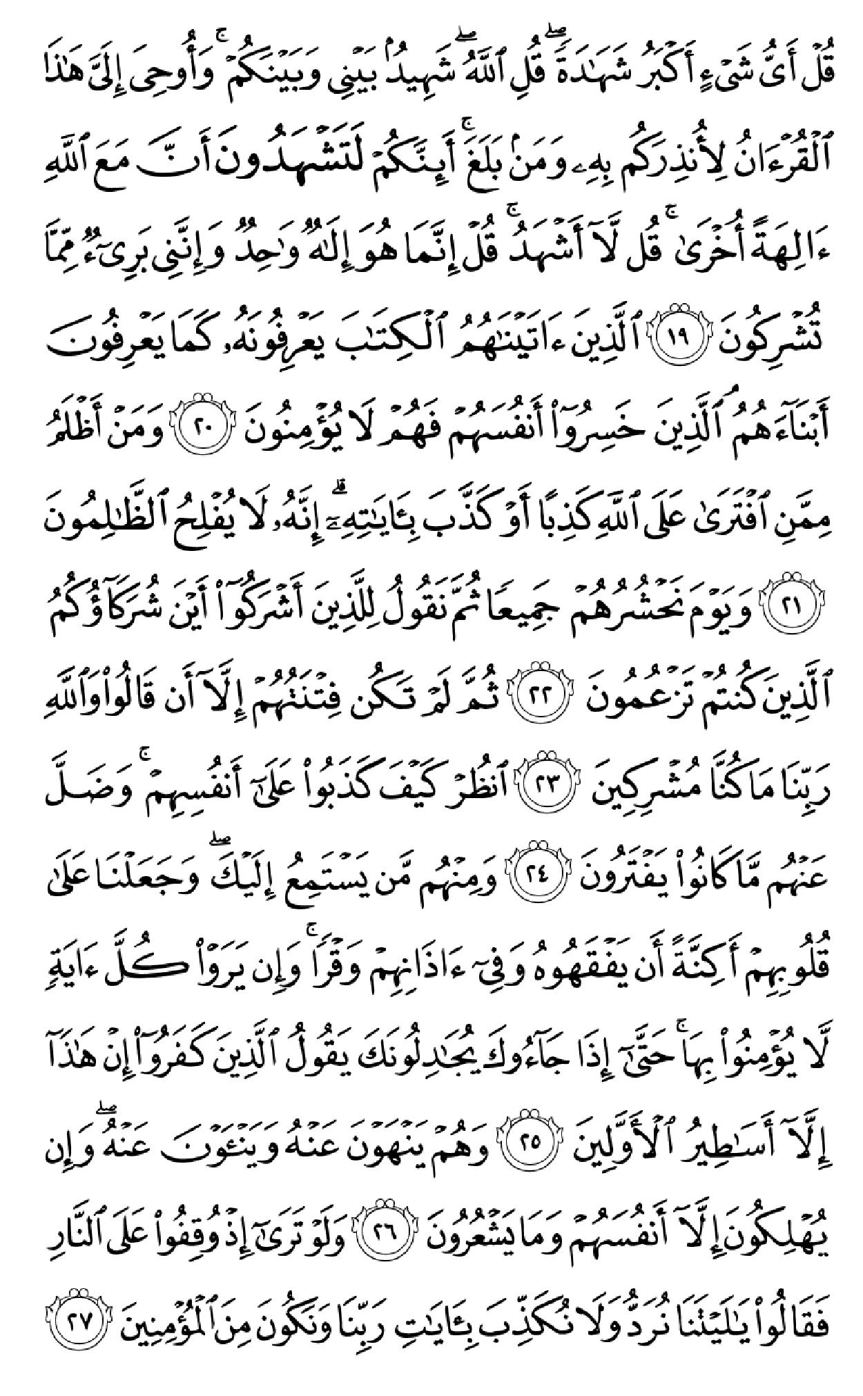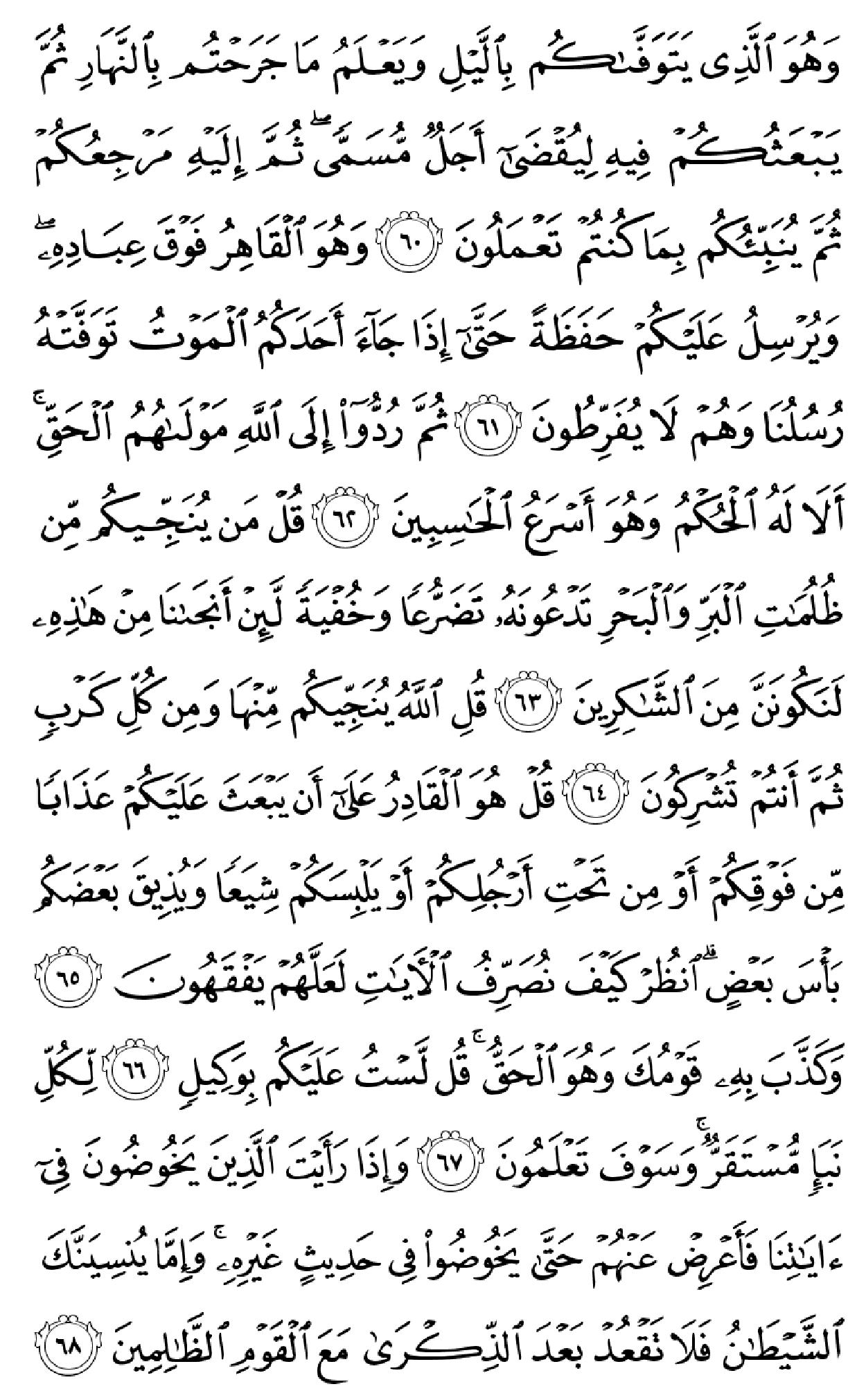 ٱلۡحَمۡدُ لِلَّهِ ٱلَّذِی خَلَقَ ٱلسَّمَٰوَٰتِ وَٱلۡأَرۡضَ وَجَعَلَ ٱلظُّلُمَٰتِ وَٱلنُّورَۖ ثُمَّ ٱلَّذِینَ کَفَرُواْ بِرَبِّهِمۡ یَعۡدِلُونَ (۱) هُوَ ٱلَّذِی خَلَقَکُم مِّن طِینٖ ثُمَّ قَضَىٰٓ أَجَلٗاۖ وَأَجَلٞ مُّسَمًّى عِندَهُۥۖ ثُمَّ أَنتُمۡ تَمۡتَرُونَ (۲) وَهُوَ ٱللَّهُ فِی ٱلسَّمَٰوَٰتِ وَفِی ٱلۡأَرۡضِ یَعۡلَمُ سِرَّکُمۡ وَجَهۡرَکُمۡ وَیَعۡلَمُ مَا تَکۡسِبُونَ (۳) وَمَا تَأۡتِیهِم مِّنۡ ءَایَهٖ مِّنۡ ءَایَٰتِ رَبِّهِمۡ إِلَّا کَانُواْ عَنۡهَا مُعۡرِضِینَ (۴) فَقَدۡ کَذَّبُواْ بِٱلۡحَقِّ لَمَّا جَآءَهُمۡ فَسَوۡفَ یَأۡتِیهِمۡ أَنۢبَـٰٓؤُاْ مَا کَانُواْ بِهِۦ یَسۡتَهۡزِءُونَ (۵) أَلَمۡ یَرَوۡاْ کَمۡ أَهۡلَکۡنَا مِن قَبۡلِهِم مِّن قَرۡنٖ مَّکَّنَّـٰهُمۡ فِی ٱلۡأَرۡضِ مَا لَمۡ نُمَکِّن لَّکُمۡ وَأَرۡسَلۡنَا ٱلسَّمَآءَ عَلَیۡهِم مِّدۡرَارٗا وَجَعَلۡنَا ٱلۡأَنۡهَٰرَ تَجۡرِی مِن تَحۡتِهِمۡ فَأَهۡلَکۡنَٰهُم بِذُنُوبِهِمۡ وَأَنشَأۡنَا مِنۢ بَعۡدِهِمۡ قَرۡنًا ءَاخَرِینَ (۶) وَلَوۡ نَزَّلۡنَا عَلَیۡکَ کِتَٰبٗا فِی قِرۡطَاسٖ فَلَمَسُوهُ بِأَیۡدِیهِمۡ لَقَالَ ٱلَّذِینَ کَفَرُوٓاْ إِنۡ هَٰذَآ إِلَّا سِحۡرٞ مُّبِینٞ (۷) وَقَالُواْ لَوۡلَآ أُنزِلَ عَلَیۡهِ مَلَکٞۖ وَلَوۡ أَنزَلۡنَا مَلَکٗا لَّقُضِیَ ٱلۡأَمۡرُ ثُمَّ لَا یُنظَرُونَ (۸) وَلَوۡ جَعَلۡنَٰهُ مَلَکٗا لَّجَعَلۡنَٰهُ رَجُلٗا وَلَلَبَسۡنَا عَلَیۡهِم مَّا یَلۡبِسُونَ (۹) وَلَقَدِ ٱسۡتُهۡزِئَ بِرُسُلٖ مِّن قَبۡلِکَ فَحَاقَ بِٱلَّذِینَ سَخِرُواْ مِنۡهُم مَّا کَانُواْ بِهِۦ یَسۡتَهۡزِءُونَ (۱۰) قُلۡ سِیرُواْ فِی ٱلۡأَرۡضِ ثُمَّ ٱنظُرُواْ کَیۡفَ کَانَ عَٰقِبَهُ ٱلۡمُکَذِّبِینَ (۱۱) قُل لِّمَن مَّا فِی ٱلسَّمَٰوَٰتِ وَٱلۡأَرۡضِۖ قُل لِّلَّهِۚ کَتَبَ عَلَىٰ نَفۡسِهِ ٱلرَّحۡمَهَۚ لَیَجۡمَعَنَّکُمۡ إِلَىٰ یَوۡمِ ٱلۡقِیَٰمَهِ لَا رَیۡبَ فِیهِۚ ٱلَّذِینَ خَسِرُوٓاْ أَنفُسَهُمۡ فَهُمۡ لَا یُؤۡمِنُونَ (۱۲) ۞وَلَهُۥ مَا سَکَنَ فِی ٱلَّیۡلِ وَٱلنَّهَارِۚ وَهُوَ ٱلسَّمِیعُ ٱلۡعَلِیمُ (۱۳) قُلۡ أَغَیۡرَ ٱللَّهِ أَتَّخِذُ وَلِیّٗا فَاطِرِ ٱلسَّمَٰوَٰتِ وَٱلۡأَرۡضِ وَهُوَ یُطۡعِمُ وَلَا یُطۡعَمُۗ قُلۡ إِنِّیٓ أُمِرۡتُ أَنۡ أَکُونَ أَوَّلَ مَنۡ أَسۡلَمَۖ وَلَا تَکُونَنَّ مِنَ ٱلۡمُشۡرِکِینَ (۱۴) قُلۡ إِنِّیٓ أَخَافُ إِنۡ عَصَیۡتُ رَبِّی عَذَابَ یَوۡمٍ عَظِیمٖ (۱۵) مَّن یُصۡرَفۡ عَنۡهُ یَوۡمَئِذٖ فَقَدۡ رَحِمَهُۥۚ وَذَٰلِکَ ٱلۡفَوۡزُ ٱلۡمُبِینُ (۱۶) وَإِن یَمۡسَسۡکَ ٱللَّهُ بِضُرّٖ فَلَا کَاشِفَ لَهُۥٓ إِلَّا هُوَۖ وَإِن یَمۡسَسۡکَ بِخَیۡرٖ فَهُوَ عَلَىٰ کُلِّ شَیۡءٖ قَدِیرٞ (۱۷) وَهُوَ ٱلۡقَاهِرُ فَوۡقَ عِبَادِهِۦۚ وَهُوَ ٱلۡحَکِیمُ ٱلۡخَبِیرُ (۱۸) قُلۡ أَیُّ شَیۡءٍ أَکۡبَرُ شَهَٰدَهٗۖ قُلِ ٱللَّهُۖ شَهِیدُۢ بَیۡنِی وَبَیۡنَکُمۡۚ وَأُوحِیَ إِلَیَّ هَٰذَا ٱلۡقُرۡءَانُ لِأُنذِرَکُم بِهِۦ وَمَنۢ بَلَغَۚ أَئِنَّکُمۡ لَتَشۡهَدُونَ أَنَّ مَعَ ٱللَّهِ ءَالِهَهً أُخۡرَىٰۚ قُل لَّآ أَشۡهَدُۚ قُلۡ إِنَّمَا هُوَ إِلَٰهٞ وَٰحِدٞ وَإِنَّنِی بَرِیٓءٞ مِّمَّا تُشۡرِکُونَ (۱۹) ٱلَّذِینَ ءَاتَیۡنَٰهُمُ ٱلۡکِتَٰبَ یَعۡرِفُونَهُۥ کَمَا یَعۡرِفُونَ أَبۡنَآءَهُمُۘ ٱلَّذِینَ خَسِرُوٓاْ أَنفُسَهُمۡ فَهُمۡ لَا یُؤۡمِنُونَ (۲۰) وَمَنۡ أَظۡلَمُ مِمَّنِ ٱفۡتَرَىٰ عَلَى ٱللَّهِ کَذِبًا أَوۡ کَذَّبَ بِـَٔایَٰتِهِۦٓۚ إِنَّهُۥ لَا یُفۡلِحُ ٱلظَّـٰلِمُونَ (۲۱) وَیَوۡمَ نَحۡشُرُهُمۡ جَمِیعٗا ثُمَّ نَقُولُ لِلَّذِینَ أَشۡرَکُوٓاْ أَیۡنَ شُرَکَآؤُکُمُ ٱلَّذِینَ کُنتُمۡ تَزۡعُمُونَ (۲۲) ثُمَّ لَمۡ تَکُن فِتۡنَتُهُمۡ إِلَّآ أَن قَالُواْ وَٱللَّهِ رَبِّنَا مَا کُنَّا مُشۡرِکِینَ (۲۳) ٱنظُرۡ کَیۡفَ کَذَبُواْ عَلَىٰٓ أَنفُسِهِمۡۚ وَضَلَّ عَنۡهُم مَّا کَانُواْ یَف