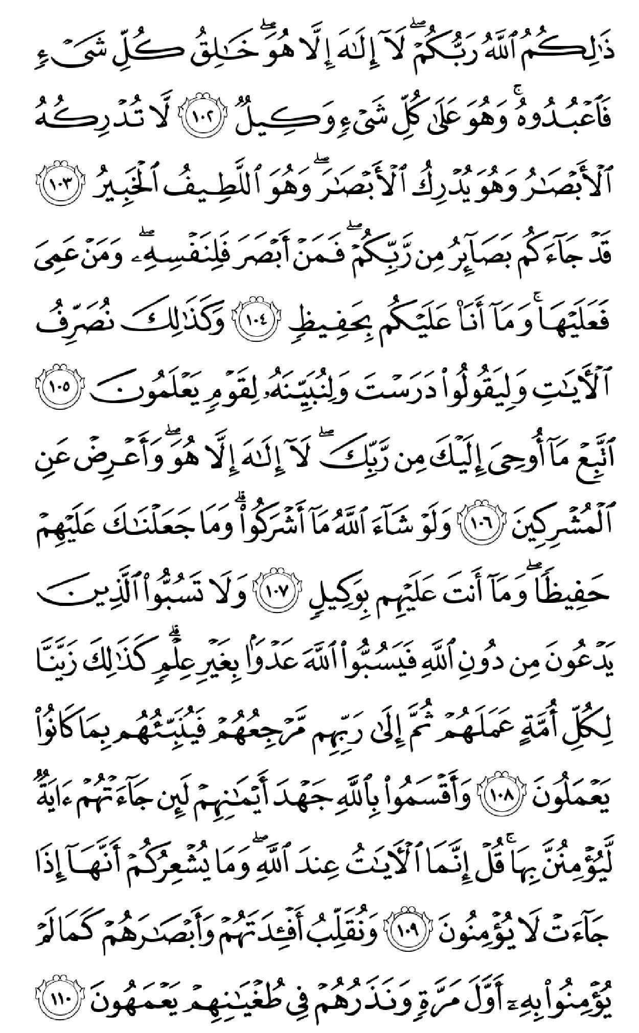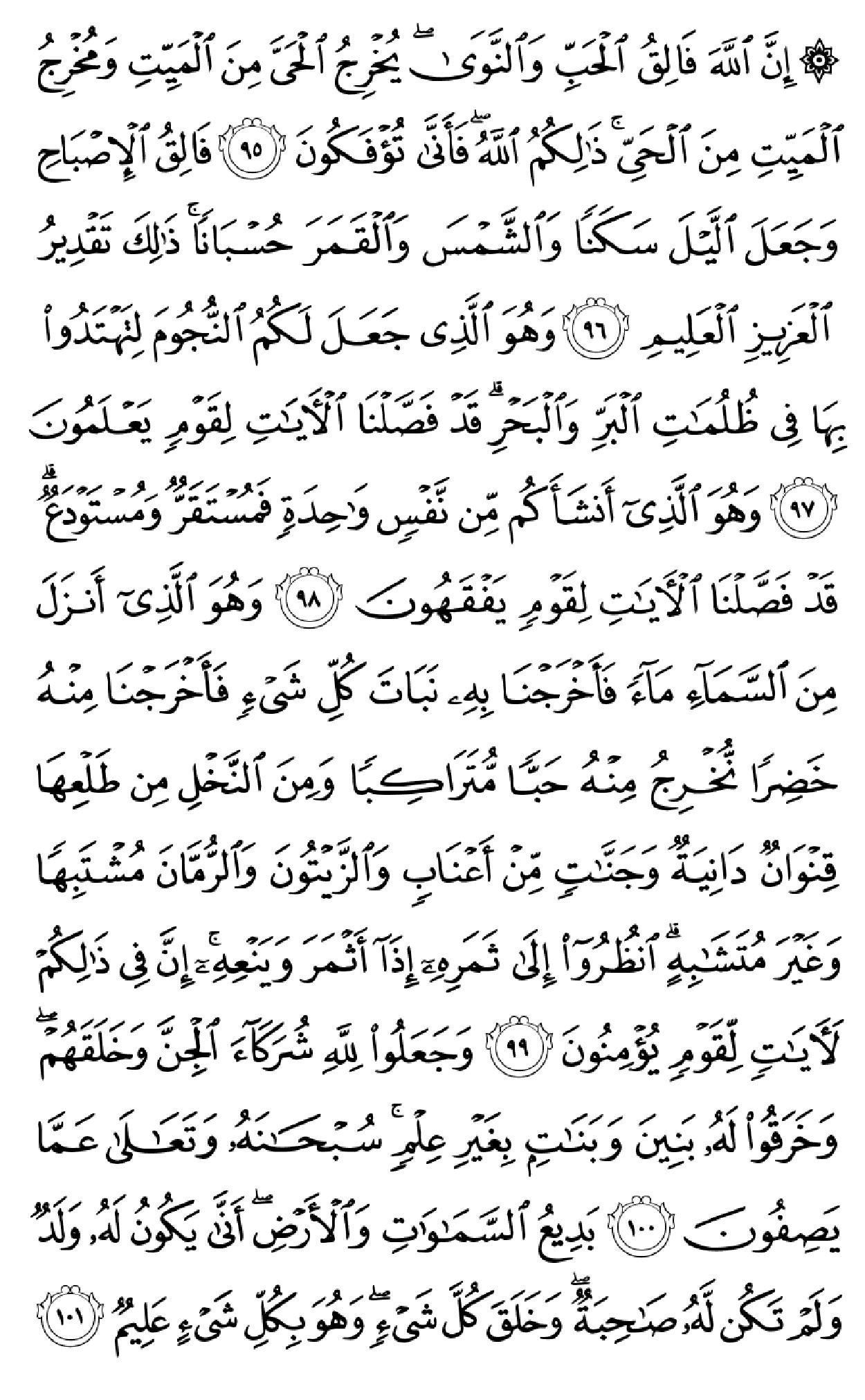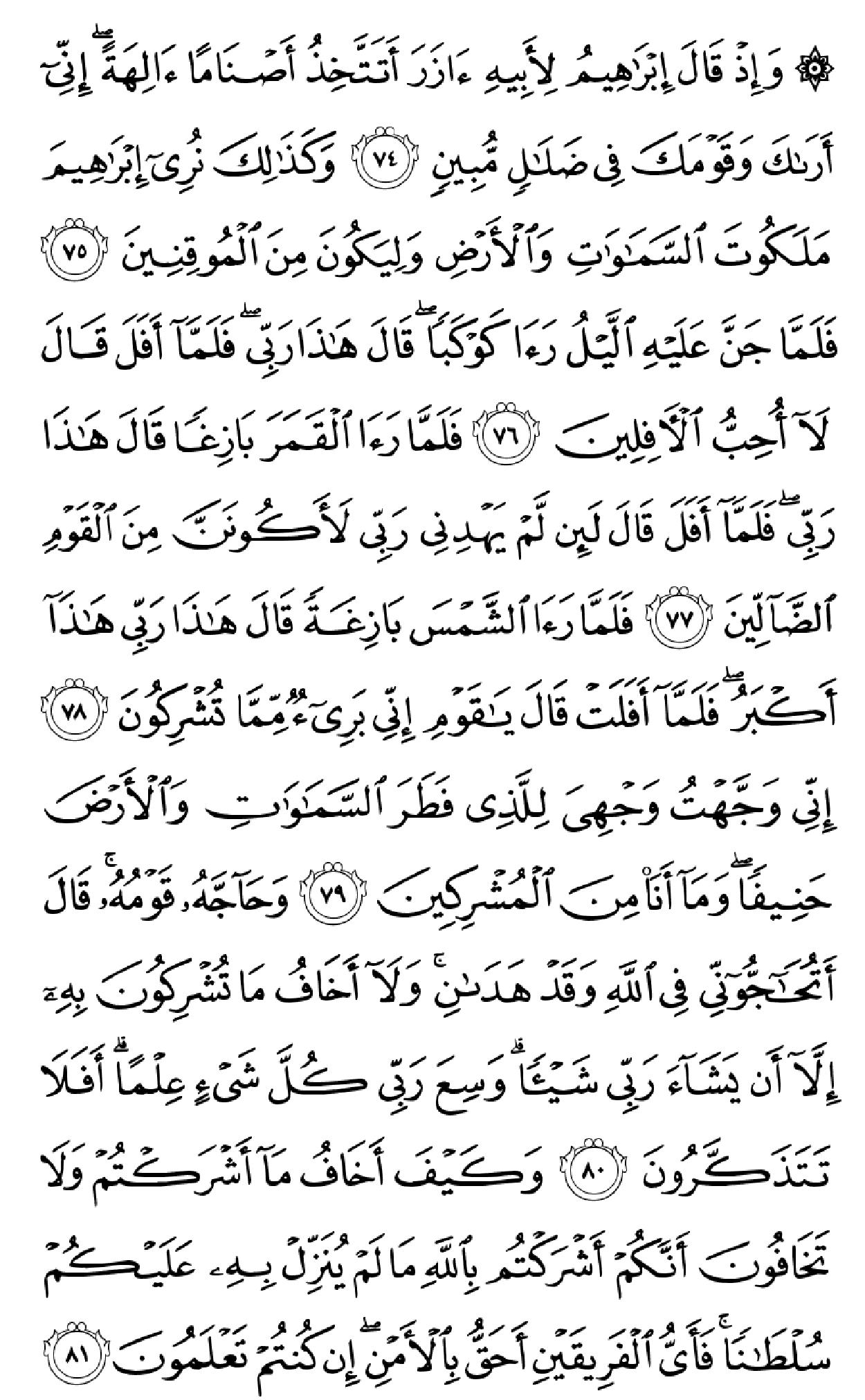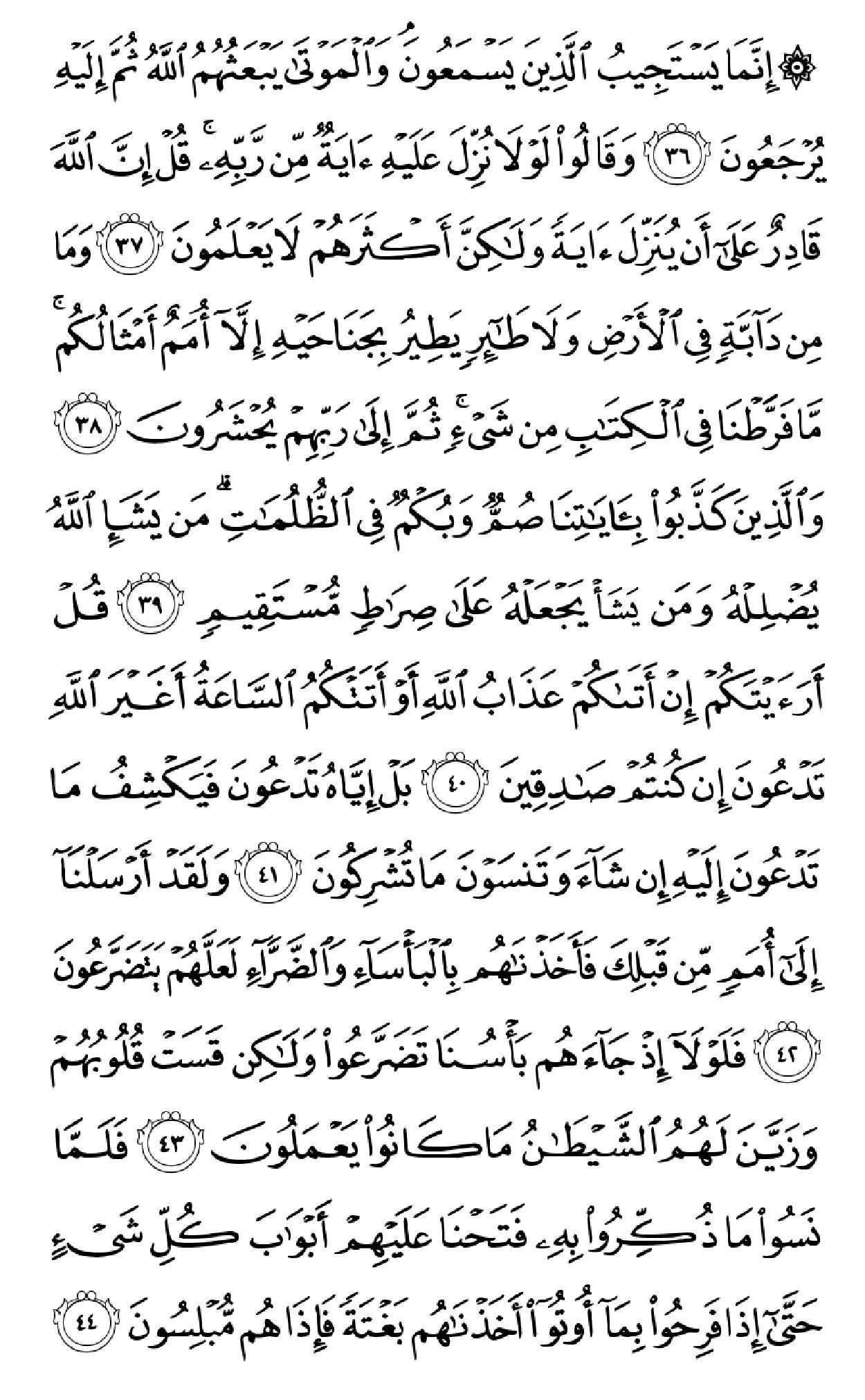 ٱلۡحَمۡدُ لِلَّهِ ٱلَّذِی خَلَقَ ٱلسَّمَٰوَٰتِ وَٱلۡأَرۡضَ وَجَعَلَ ٱلظُّلُمَٰتِ وَٱلنُّورَۖ ثُمَّ ٱلَّذِینَ کَفَرُواْ بِرَبِّهِمۡ یَعۡدِلُونَ (۱) هُوَ ٱلَّذِی خَلَقَکُم مِّن طِینٖ ثُمَّ قَضَىٰٓ أَجَلٗاۖ وَأَجَلٞ مُّسَمًّى عِندَهُۥۖ ثُمَّ أَنتُمۡ تَمۡتَرُونَ (۲) وَهُوَ ٱللَّهُ فِی ٱلسَّمَٰوَٰتِ وَفِی ٱلۡأَرۡضِ یَعۡلَمُ سِرَّکُمۡ وَجَهۡرَکُمۡ وَیَعۡلَمُ مَا تَکۡسِبُونَ (۳) وَمَا تَأۡتِیهِم مِّنۡ ءَایَهٖ مِّنۡ ءَایَٰتِ رَبِّهِمۡ إِلَّا کَانُواْ عَنۡهَا مُعۡرِضِینَ (۴) فَقَدۡ کَذَّبُواْ بِٱلۡحَقِّ لَمَّا جَآءَهُمۡ فَسَوۡفَ یَأۡتِیهِمۡ أَنۢبَـٰٓؤُاْ مَا کَانُواْ بِهِۦ یَسۡتَهۡزِءُونَ (۵) أَلَمۡ یَرَوۡاْ کَمۡ أَهۡلَکۡنَا مِن قَبۡلِهِم مِّن قَرۡنٖ مَّکَّنَّـٰهُمۡ فِی ٱلۡأَرۡضِ مَا لَمۡ نُمَکِّن لَّکُمۡ وَأَرۡسَلۡنَا ٱلسَّمَآءَ عَلَیۡهِم مِّدۡرَارٗا وَجَعَلۡنَا ٱلۡأَنۡهَٰرَ تَجۡرِی مِن تَحۡتِهِمۡ فَأَهۡلَکۡنَٰهُم بِذُنُوبِهِمۡ وَأَنشَأۡنَا مِنۢ بَعۡدِهِمۡ قَرۡنًا ءَاخَرِینَ (۶) وَلَوۡ نَزَّلۡنَا عَلَیۡکَ کِتَٰبٗا فِی قِرۡطَاسٖ فَلَمَسُوهُ بِأَیۡدِیهِمۡ لَقَالَ ٱلَّذِینَ کَفَرُوٓاْ إِنۡ هَٰذَآ إِلَّا سِحۡرٞ مُّبِینٞ (۷) وَقَالُواْ لَوۡلَآ أُنزِلَ عَلَیۡهِ مَلَکٞۖ وَلَوۡ أَنزَلۡنَا مَلَکٗا لَّقُضِیَ ٱلۡأَمۡرُ ثُمَّ لَا یُنظَرُونَ (۸) وَلَوۡ جَعَلۡنَٰهُ مَلَکٗا لَّجَعَلۡنَٰهُ رَجُلٗا وَلَلَبَسۡنَا عَلَیۡهِم مَّا یَلۡبِسُونَ (۹) وَلَقَدِ ٱسۡتُهۡزِئَ بِرُسُلٖ مِّن قَبۡلِکَ فَحَاقَ بِٱلَّذِینَ سَخِرُواْ مِنۡهُم مَّا کَانُواْ بِهِۦ یَسۡتَهۡزِءُونَ (۱۰) قُلۡ سِیرُواْ فِی ٱلۡأَرۡضِ ثُمَّ ٱنظُرُواْ کَیۡفَ کَانَ عَٰقِبَهُ ٱلۡمُکَذِّبِینَ (۱۱) قُل لِّمَن مَّا فِی ٱلسَّمَٰوَٰتِ وَٱلۡأَرۡضِۖ قُل لِّلَّهِۚ کَتَبَ عَلَىٰ نَفۡسِهِ ٱلرَّحۡمَهَۚ لَیَجۡمَعَنَّکُمۡ إِلَىٰ یَوۡمِ ٱلۡقِیَٰمَهِ لَا رَیۡبَ فِیهِۚ ٱلَّذِینَ خَسِرُوٓاْ أَنفُسَهُمۡ فَهُمۡ لَا یُؤۡمِنُونَ (۱۲) ۞وَلَهُۥ مَا سَکَنَ فِی ٱلَّیۡلِ وَٱلنَّهَارِۚ وَهُوَ ٱلسَّمِیعُ ٱلۡعَلِیمُ (۱۳) قُلۡ أَغَیۡرَ ٱللَّهِ أَتَّخِذُ وَلِیّٗا فَاطِرِ ٱلسَّمَٰوَٰتِ وَٱلۡأَرۡضِ وَهُوَ یُطۡعِمُ وَلَا یُطۡعَمُۗ قُلۡ إِنِّیٓ أُمِرۡتُ أَنۡ أَکُونَ أَوَّلَ مَنۡ أَسۡلَمَۖ وَلَا تَکُونَنَّ مِنَ ٱلۡمُشۡرِکِینَ (۱۴) قُلۡ إِنِّیٓ أَخَافُ إِنۡ عَصَیۡتُ رَبِّی عَذَابَ یَوۡمٍ عَظِیمٖ (۱۵) مَّن یُصۡرَفۡ عَنۡهُ یَوۡمَئِذٖ فَقَدۡ رَحِمَهُۥۚ وَذَٰلِکَ ٱلۡفَوۡزُ ٱلۡمُبِینُ (۱۶) وَإِن یَمۡسَسۡکَ ٱللَّهُ بِضُرّٖ فَلَا کَاشِفَ لَهُۥٓ إِلَّا هُوَۖ وَإِن یَمۡسَسۡکَ بِخَیۡرٖ فَهُوَ عَلَىٰ کُلِّ شَیۡءٖ قَدِیرٞ (۱۷) وَهُوَ ٱلۡقَاهِرُ فَوۡقَ عِبَادِهِۦۚ وَهُوَ ٱلۡحَکِیمُ ٱلۡخَبِیرُ (۱۸) قُلۡ أَیُّ شَیۡءٍ أَکۡبَرُ شَهَٰدَهٗۖ قُلِ ٱللَّهُۖ شَهِیدُۢ بَیۡنِی وَبَیۡنَکُمۡۚ وَأُوحِیَ إِلَیَّ هَٰذَا ٱلۡقُرۡءَانُ لِأُنذِرَکُم بِهِۦ وَمَنۢ بَلَغَۚ أَئِنَّکُمۡ لَتَشۡهَدُونَ أَنَّ مَعَ ٱللَّهِ ءَالِهَهً أُخۡرَىٰۚ قُل لَّآ أَشۡهَدُۚ قُلۡ إِنَّمَا هُوَ إِلَٰهٞ وَٰحِدٞ وَإِنَّنِی بَرِیٓءٞ مِّمَّا تُشۡرِکُونَ (۱۹) ٱلَّذِینَ ءَاتَیۡنَٰهُمُ ٱلۡکِتَٰبَ یَعۡرِفُونَهُۥ کَمَا یَعۡرِفُونَ أَبۡنَآءَهُمُۘ ٱلَّذِینَ خَسِرُوٓاْ أَنفُسَهُمۡ فَهُمۡ لَا یُؤۡمِنُونَ (۲۰) وَمَنۡ أَظۡلَمُ مِمَّنِ ٱفۡتَرَىٰ عَلَى ٱللَّهِ کَذِبًا أَوۡ کَذَّبَ بِـَٔایَٰتِهِۦٓۚ إِنَّهُۥ لَا یُفۡلِحُ ٱلظَّـٰلِمُونَ (۲۱) وَیَوۡمَ نَحۡشُرُهُمۡ جَمِیعٗا ثُمَّ نَقُولُ لِلَّذِینَ أَشۡرَکُوٓاْ أَیۡنَ شُرَکَآؤُکُمُ ٱلَّذِینَ کُنتُمۡ تَزۡعُمُونَ (۲۲) ثُمَّ لَمۡ تَکُن فِتۡنَتُهُمۡ إِلَّآ أَن قَالُواْ وَٱللَّهِ رَبِّنَا مَا کُنَّا مُشۡرِکِینَ (۲۳) ٱنظُرۡ کَیۡفَ کَذَبُواْ عَلَىٰٓ أَنفُسِهِمۡۚ وَضَلَّ عَنۡهُم مَّا کَانُواْ یَف