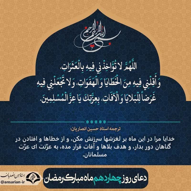 ماه مبارک رمضان، فرصتی استثنایی برای نزدیکی به خداوند و طلب آمرزش است. دعا های روزانه این ماه، هر یک دریچ ه ای به سوی رحمت الهی می گشایند. دعای روز چهاردهم، با مضمونی سرشار از تواضع و امید، از خداوند می خواهد که لغزش ها و خطا های ما را ببخشاید و ما را از بلا ها دور نگه دارد. در ادامه، متن دعا، ترجمه، شرح، صوت مرحوم موسوی قهار و تصویر مرتبط ارائه شده است.