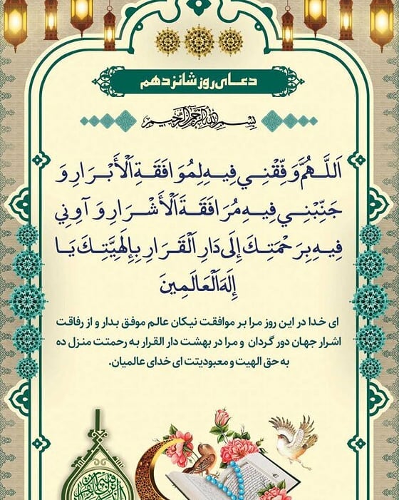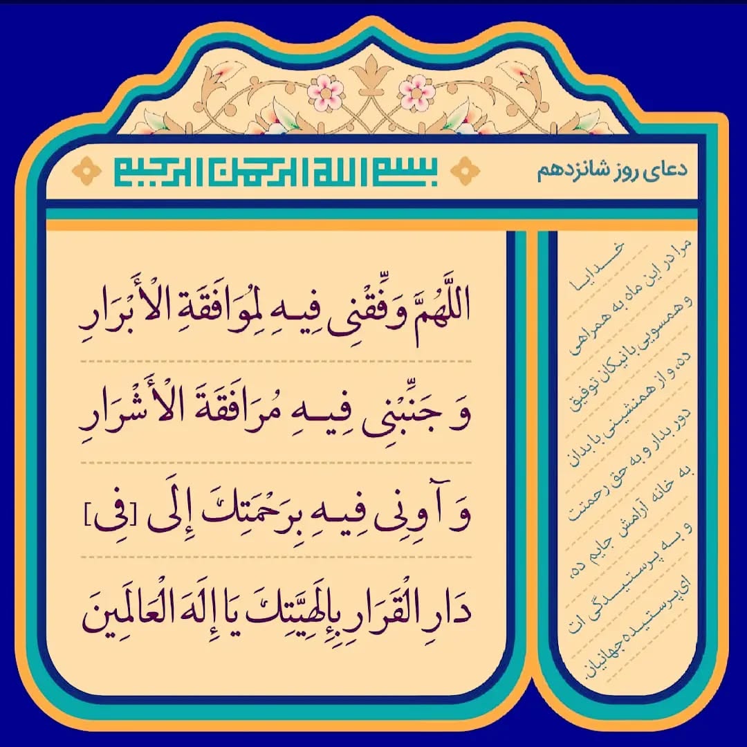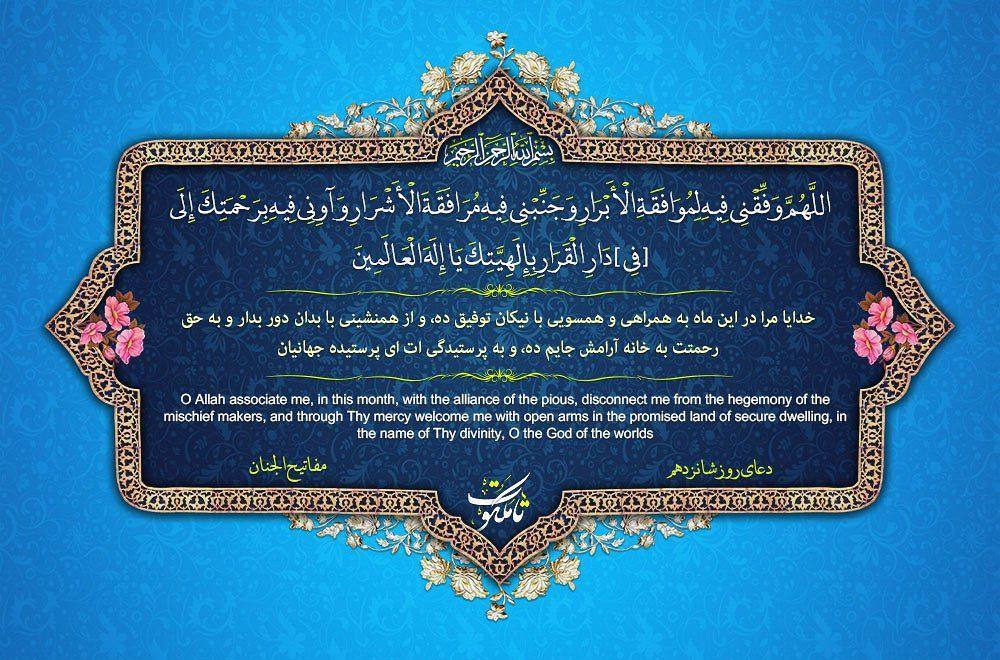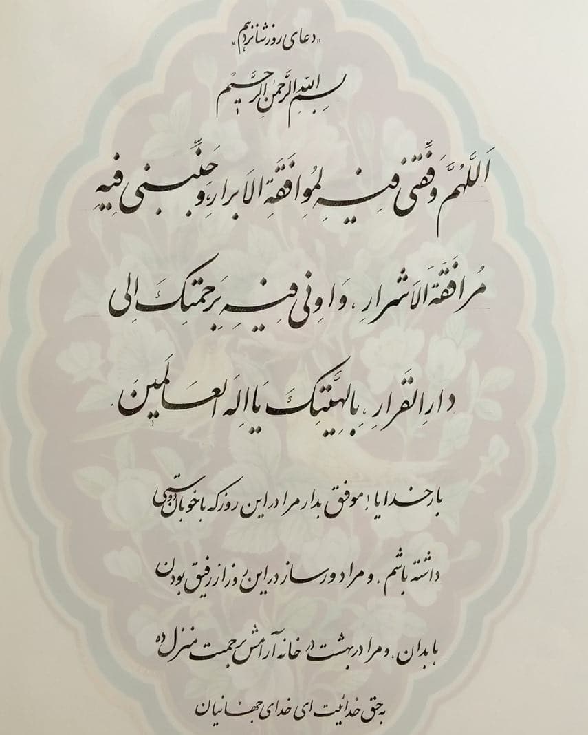 «خدایا، در این روز مرا به موافقت و همراهی با نیکان موفق بدار و از همنشینی با بدان دورم ساز و به رحمتت مرا در خانه آرامش (بهشت) جای ده، به خدایی ات ای خدای جهانیان.»