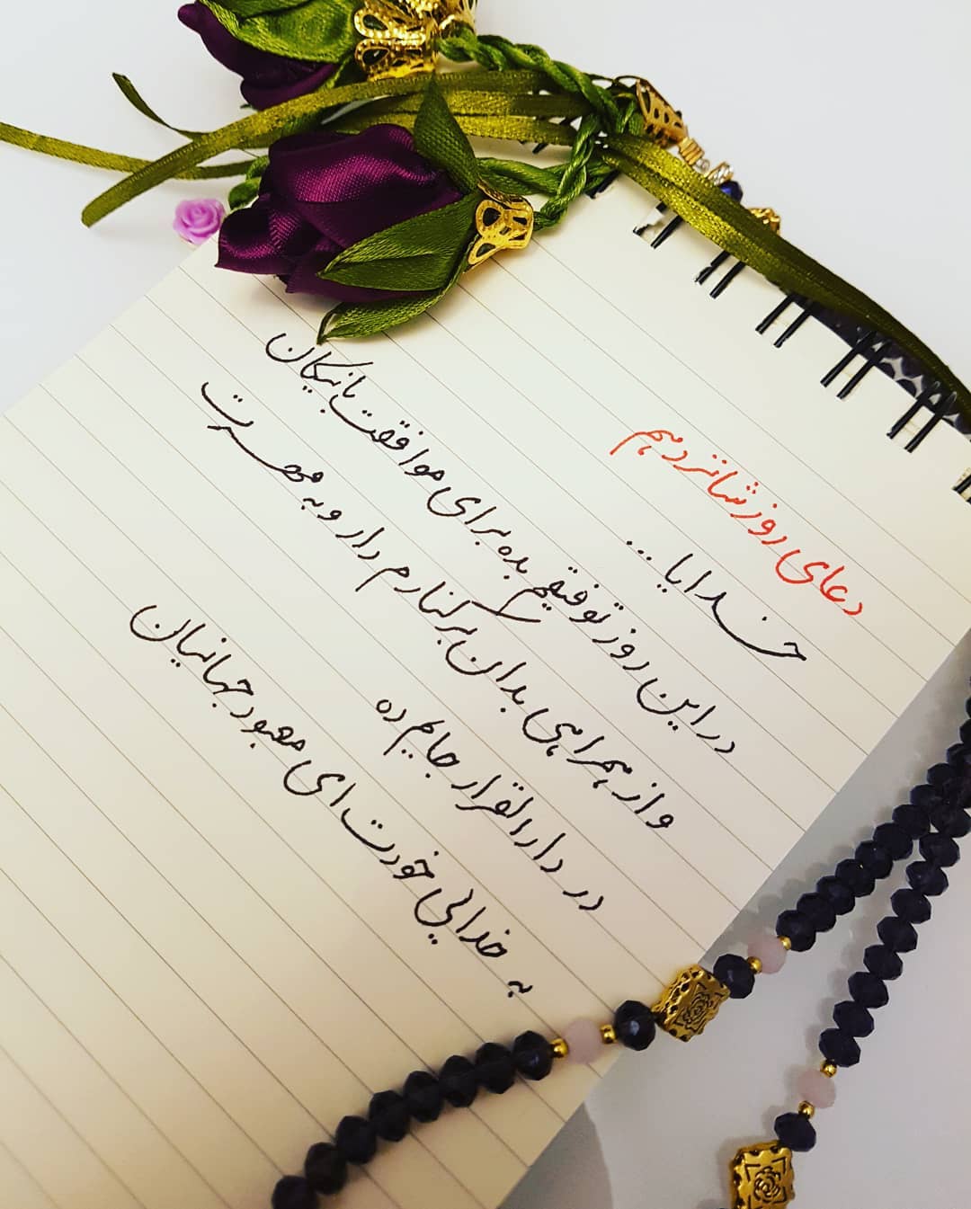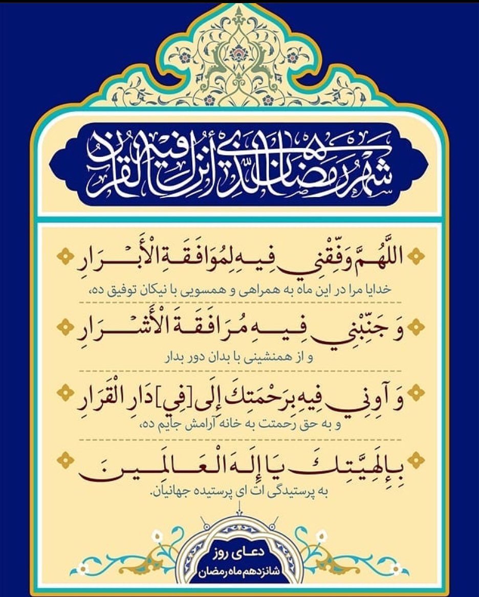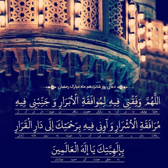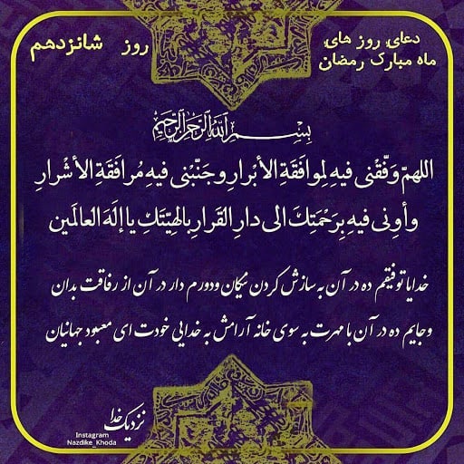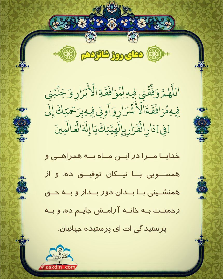 «خدایا، در این روز مرا به موافقت و همراهی با نیکان موفق بدار و از همنشینی با بدان دورم ساز و به رحمتت مرا در خانه آرامش (بهشت) جای ده، به خدایی ات ای خدای جهانیان.»