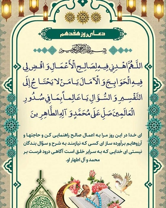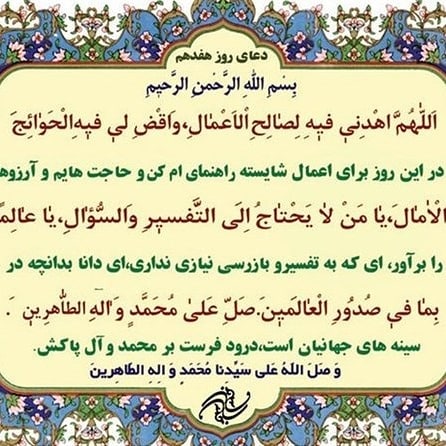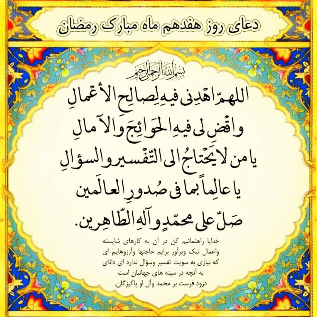 ماه مبارک رمضان، ماه رحمت و مغفرت الهی، فرصتی است برای بندگان تا با دعا و مناجات، خود را به پروردگار نزدیک تر کنند. دعای روز هفدهم این ماه، یکی از زیبا ترین نیایش هایی است که در آن از خداوند درخواست هدایت به سوی اعمال صالح و برآورده شدن نیاز ها و آرزو ها می شود. این دعا با اشاره به علم بی نیاز و بی کران خداوند، عظمت او را یادآوری می کند و با درود بر پیامبر اکرم (ص) و اهل بیت پاکش (ع)، به پایان می رسد.