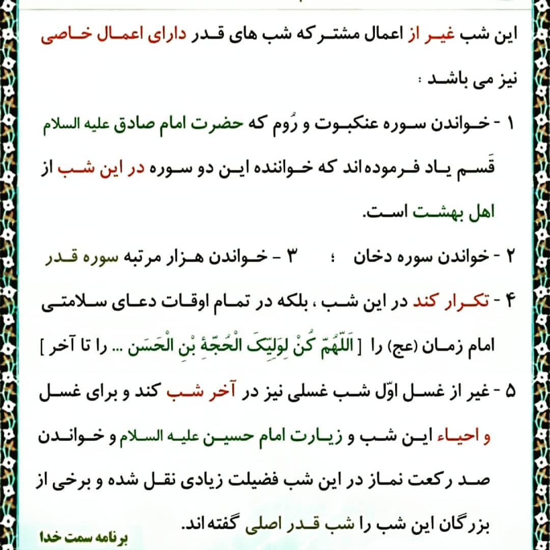 تلاوت سوره های «عنکبوت» و «روم». امام صادق (ع) قسم خورده اند که هر کس این دو سوره را در این شب بخواند، از اهل بهشت خواهد بود.