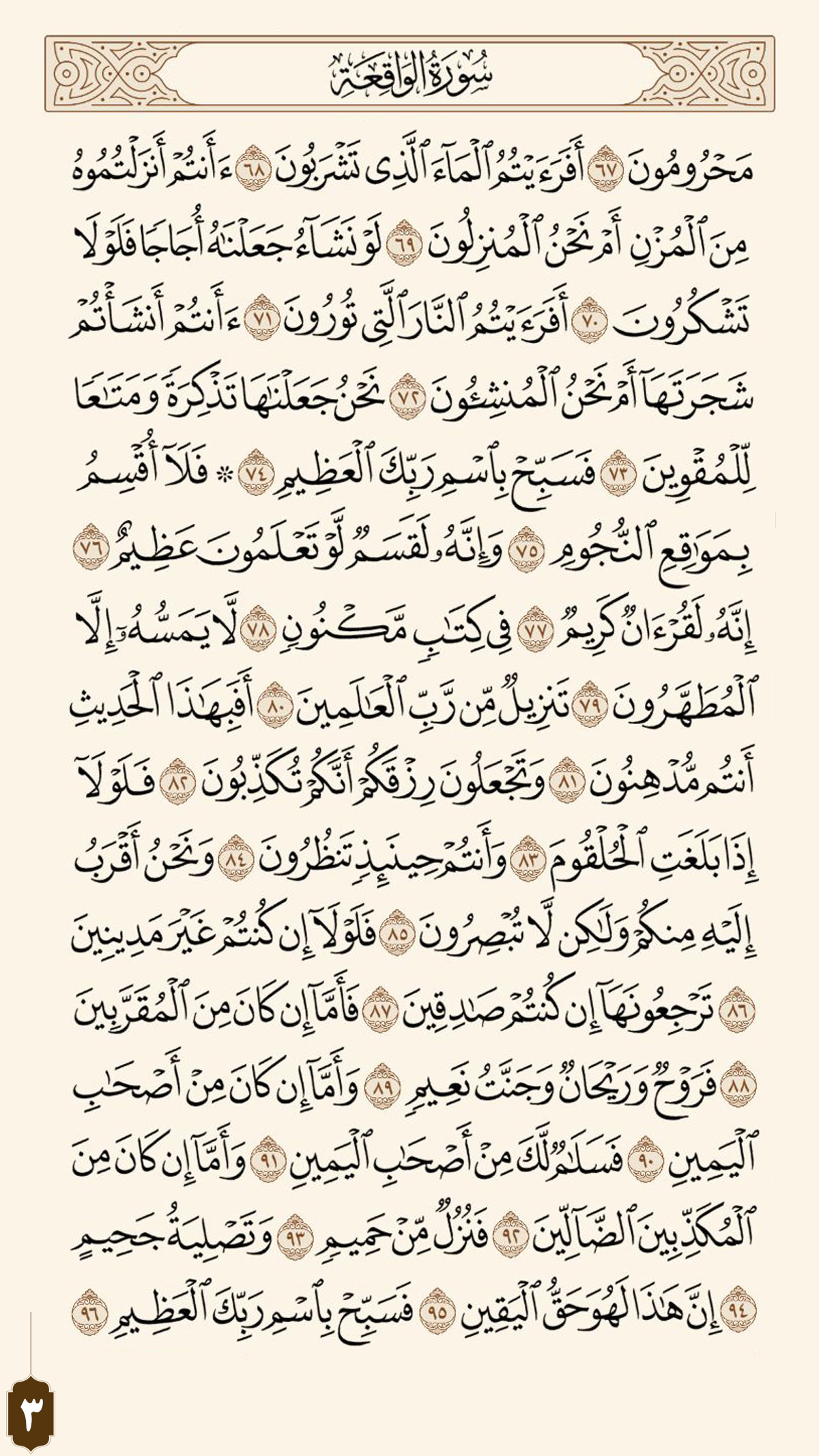 پیامبر اکرم (ص) فرمودند: «هرکس سوره واقعه را هر شب بخواند، فقر و پریشانی به او نرسد.»