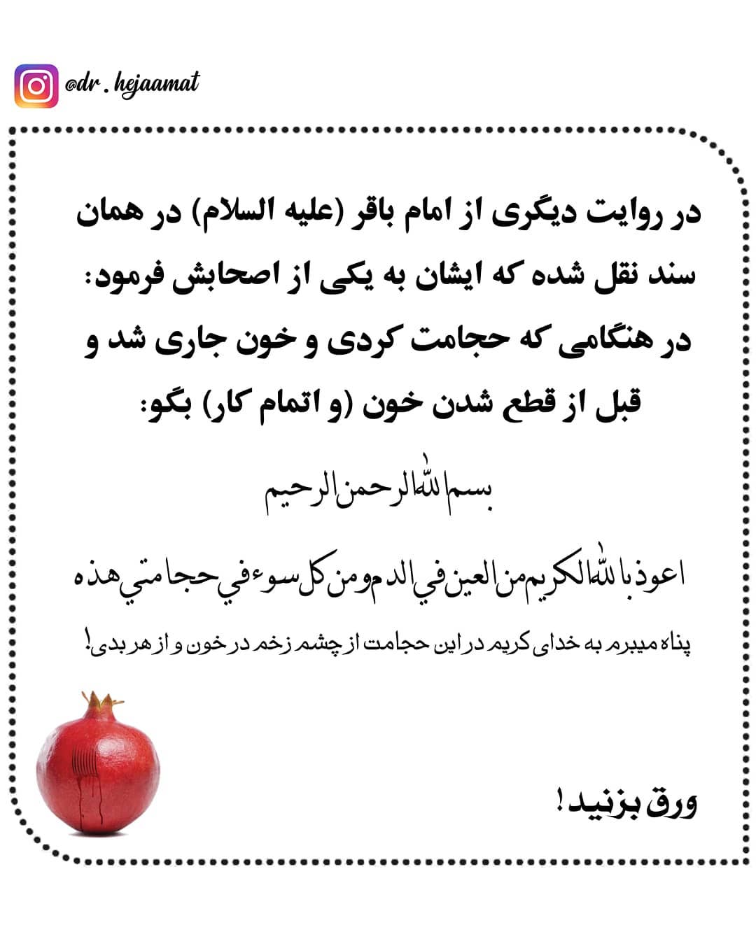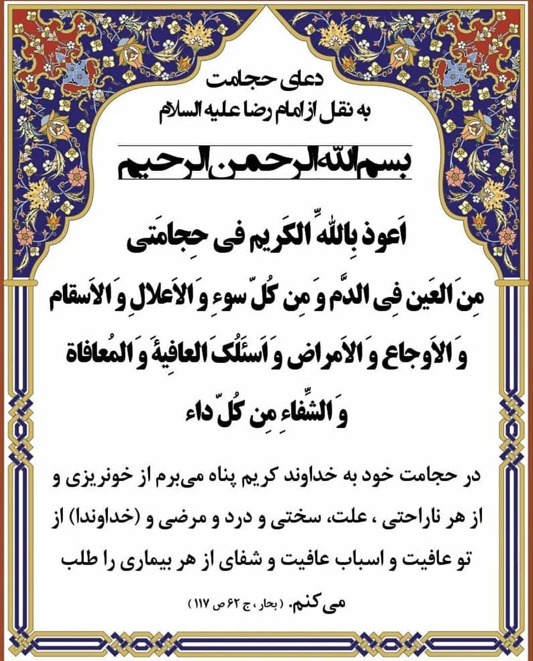 در حجامت خود به خدای کریم پناه می برم از چشم زخم در خون، از هر بدی، بیماری، درد، ناخوشی و سختی. و از خداوند عافیت و سلامت کامل و شفا از هر بیماری را طلب می کنم.