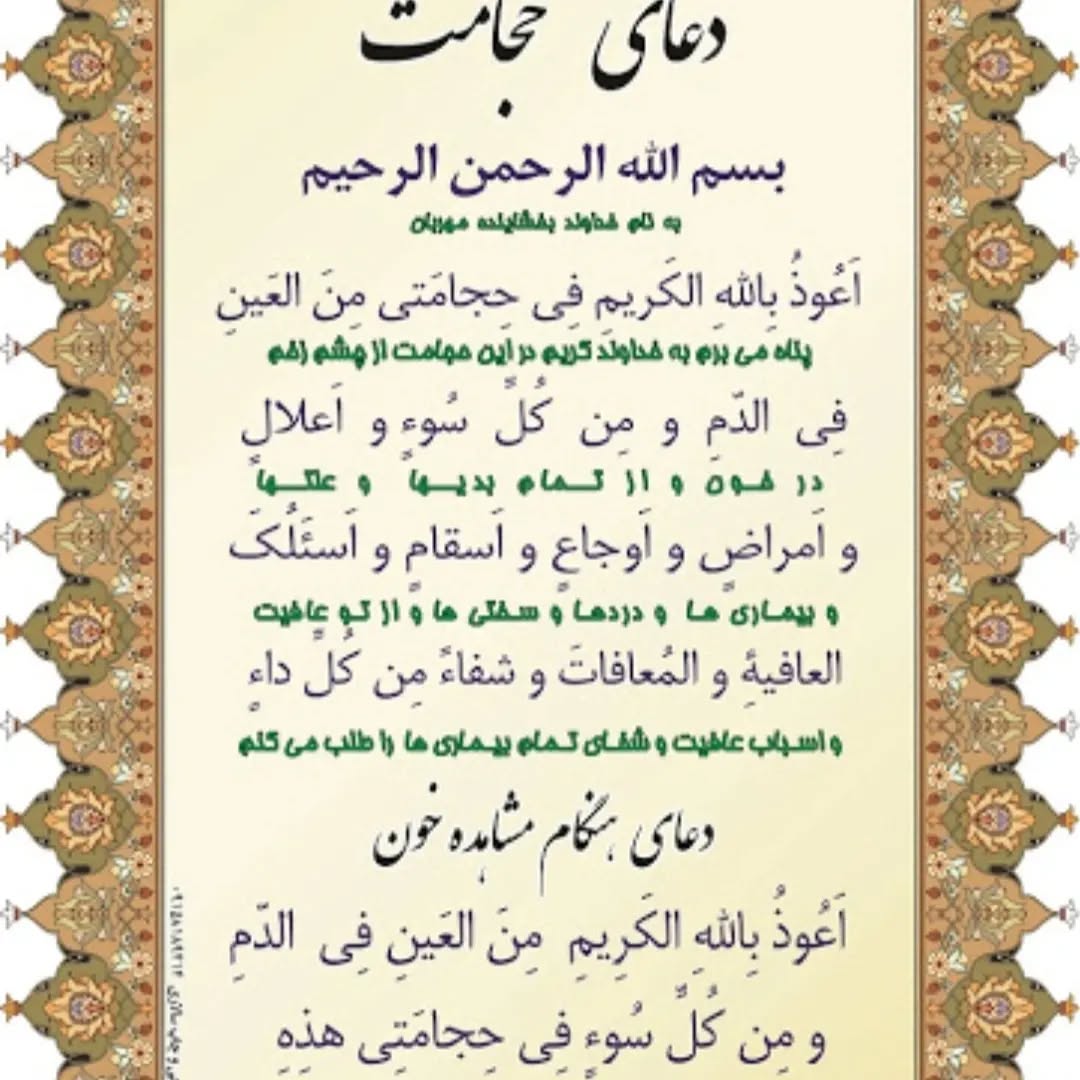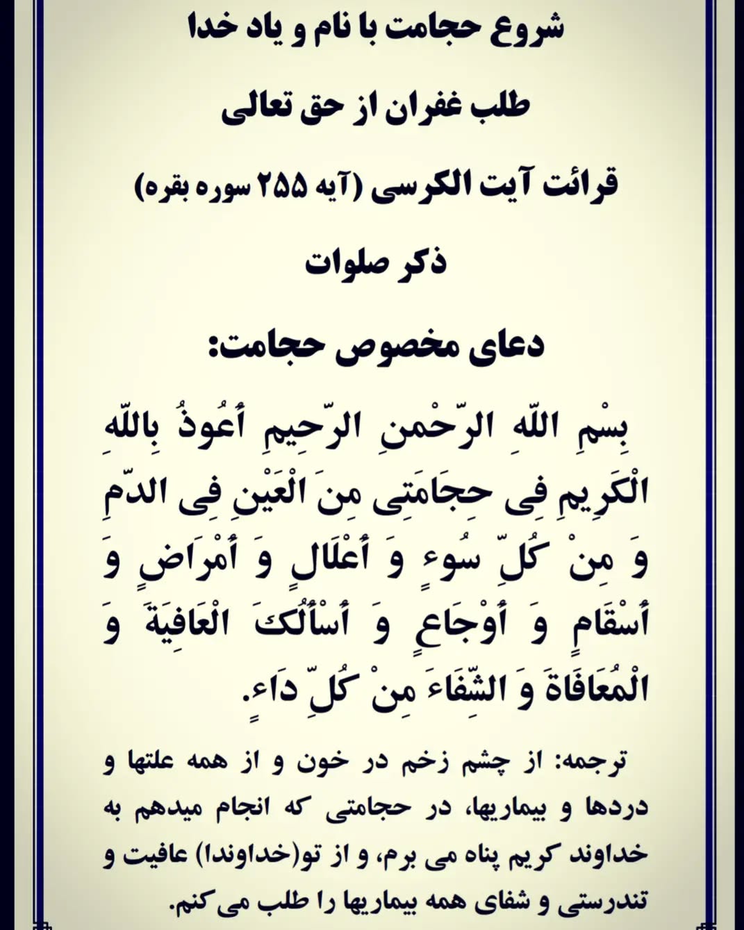 متن و ترجمه دعای حجامت که از امام رضا (ع) روایت شده است به این شرح می باشد: