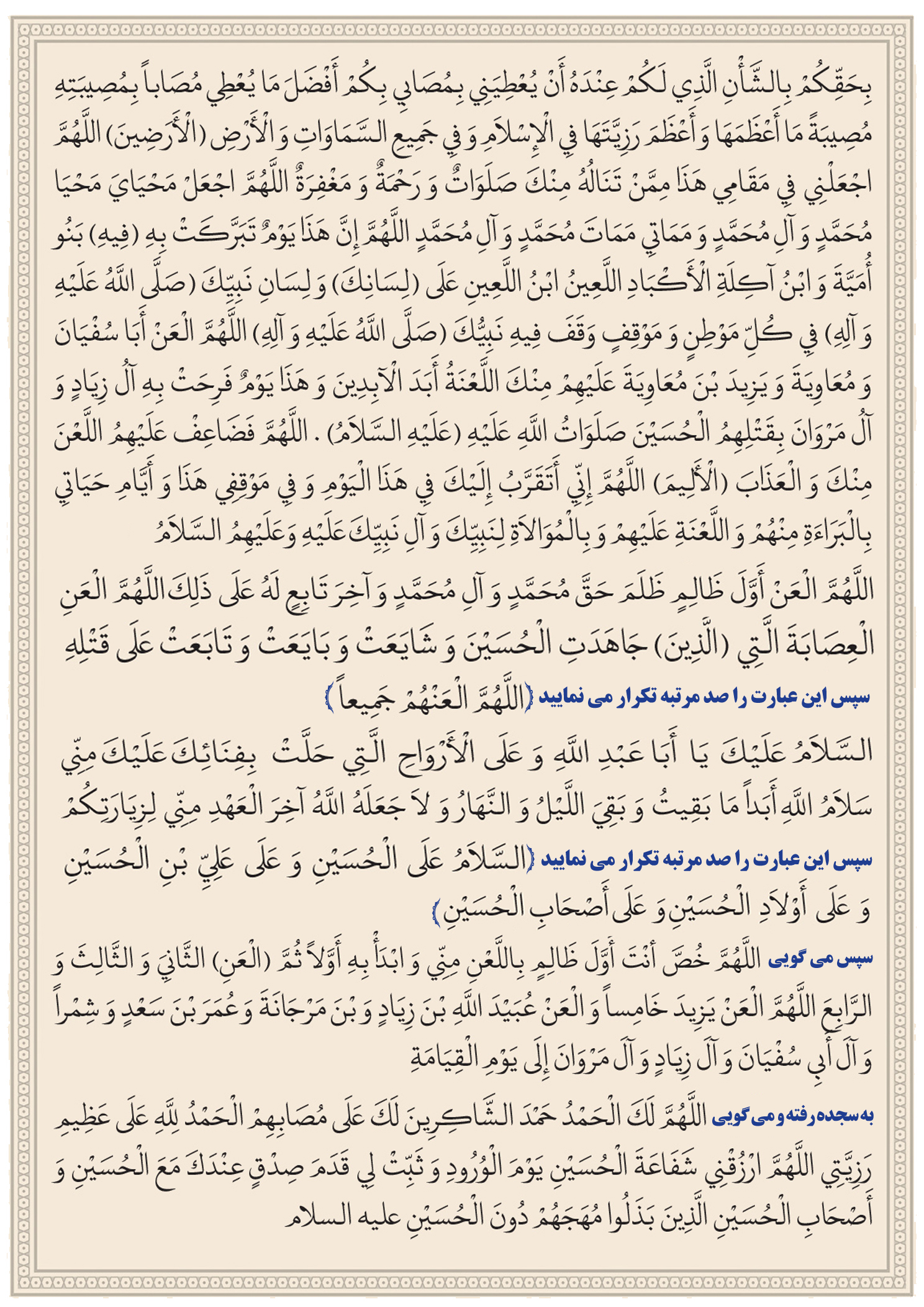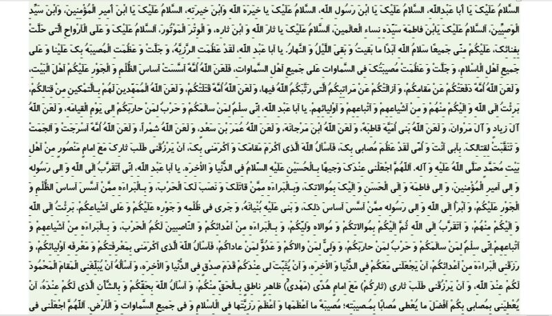 اَلسَّلامُ عَلَیْکَ یا اَباعَبْدِاللَّهِ اَلسَّلامُ عَلَیْکَ یَابْنَ رَسُولِ اللَّهِ اَلسَّلامُ عَلَیْکَ یا خِیَرَهَ اللَّهِ و َابْنَ خِیَرَتِهِ اَلسَّلامُ عَلَیْکَ یَابْنَ اَمیرِالْمُؤْمِنینَ و َابْنَ سَیِّدِ الْوَصِیّینَ