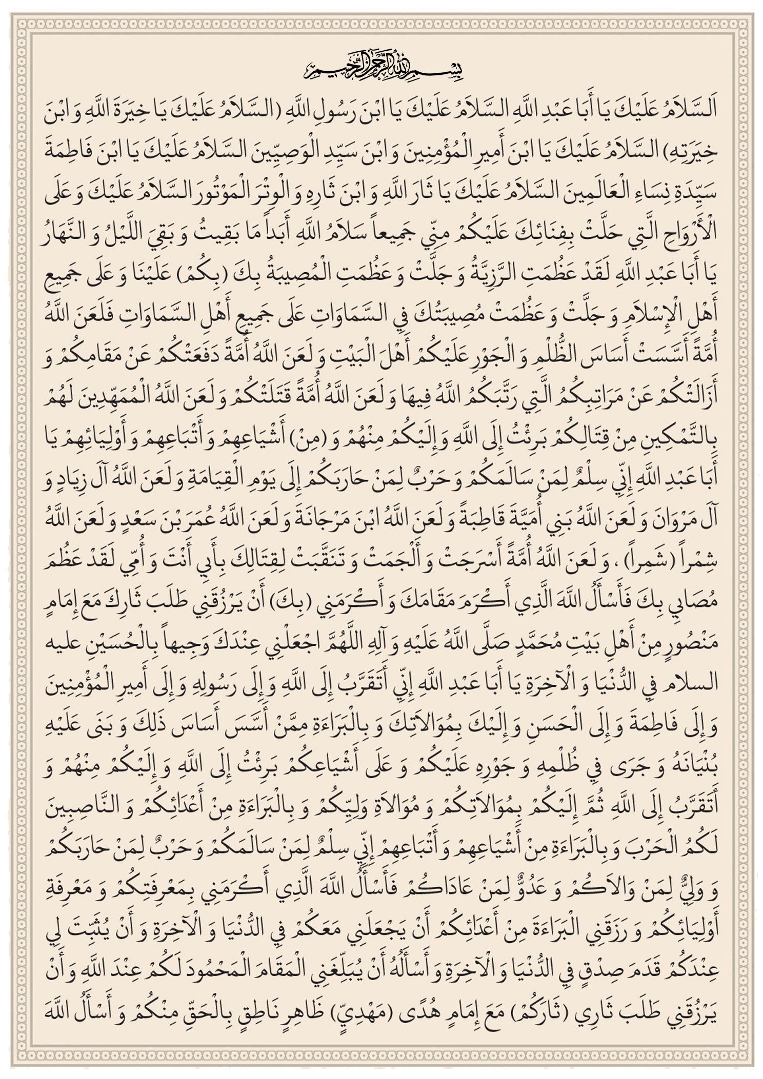یا اَباعَبْدِاللَّهِ اِنّی سِلْمٌ لِمَنْ سالَمَکُمْ وَ حَرْبٌ لِمَنْ حارَبَکُمْ اِلی یَوْمِ الْقِیامَهِ