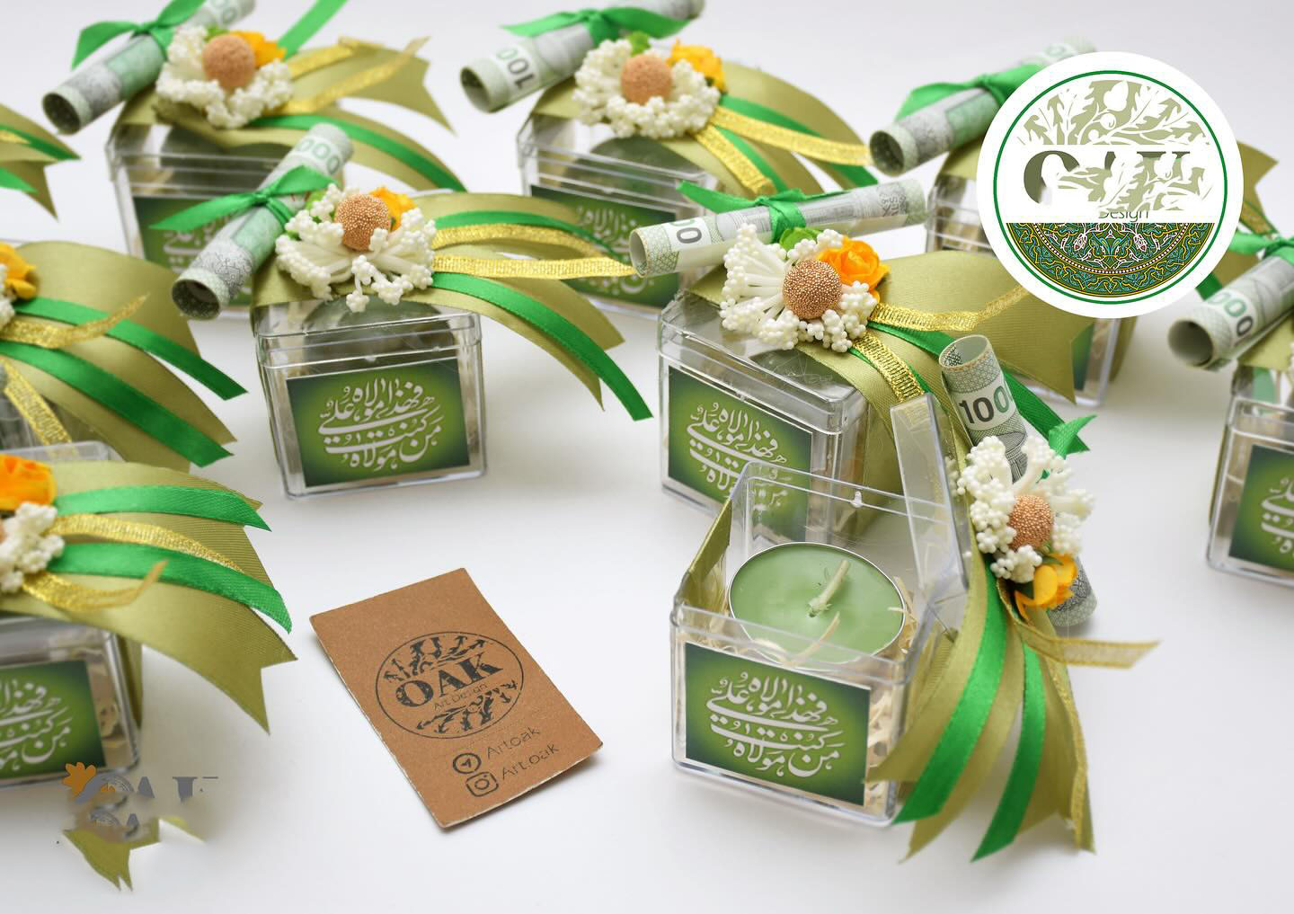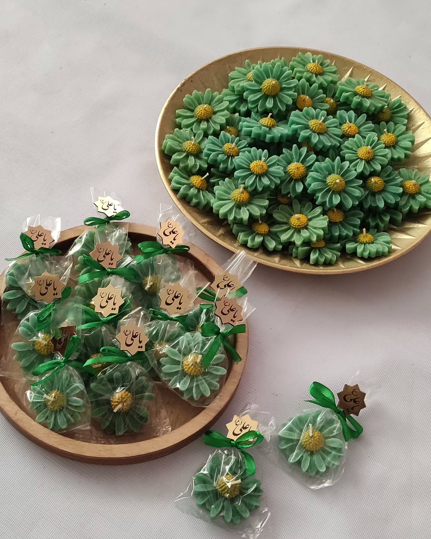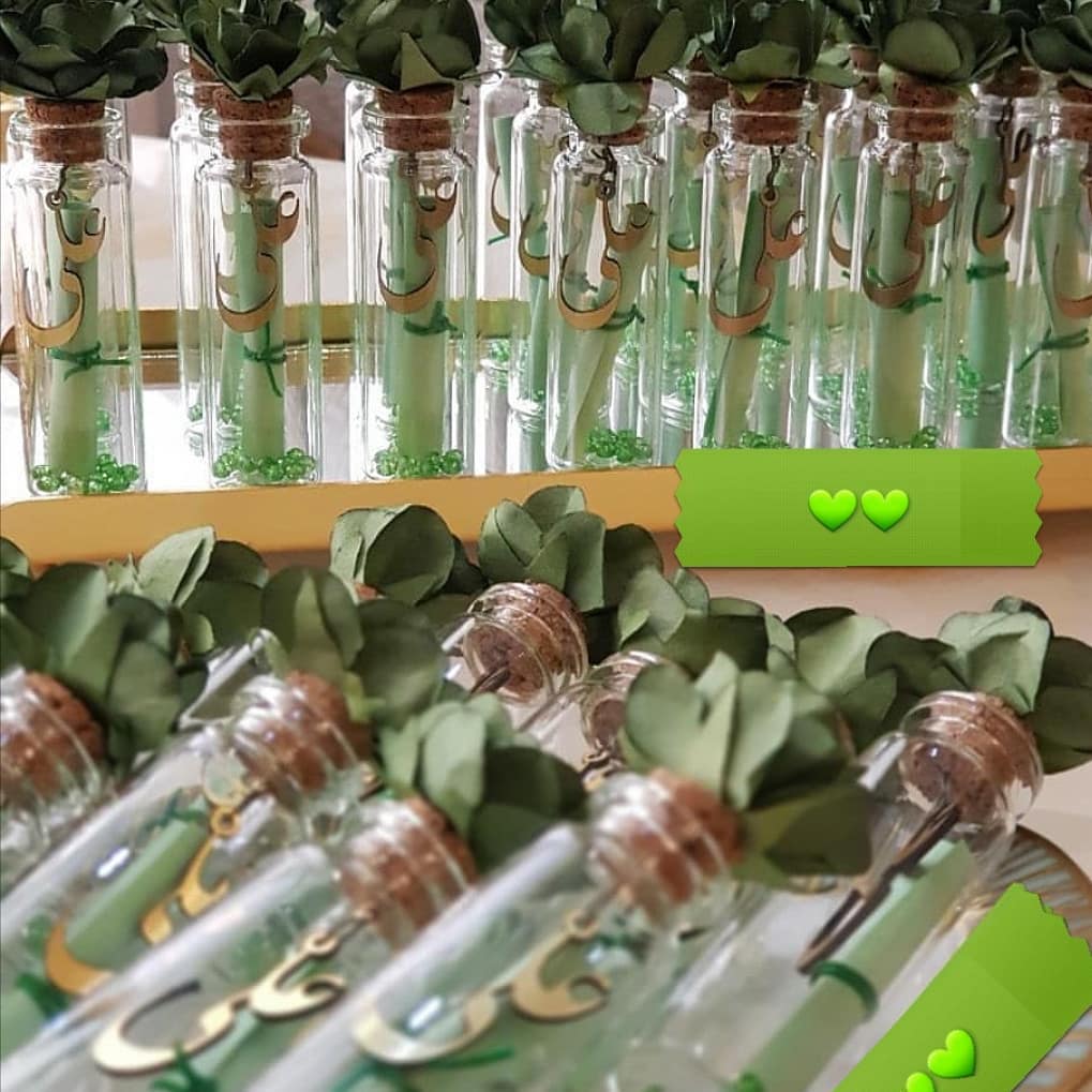 یکی از زیباترین ایده ها، استفاده از شمع های تزئینی با طرح یا نوشته یا علی است که میتوان آن را در ظروف شیشه ای کوچک یا بسته بندی تور دار ارائه داد.