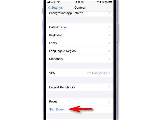حالا گوشی خاموش میشود. برای روشن کردن مجدد، دکمه کناری را نگه دارید تا لوگوی اپل ظاهر شود.