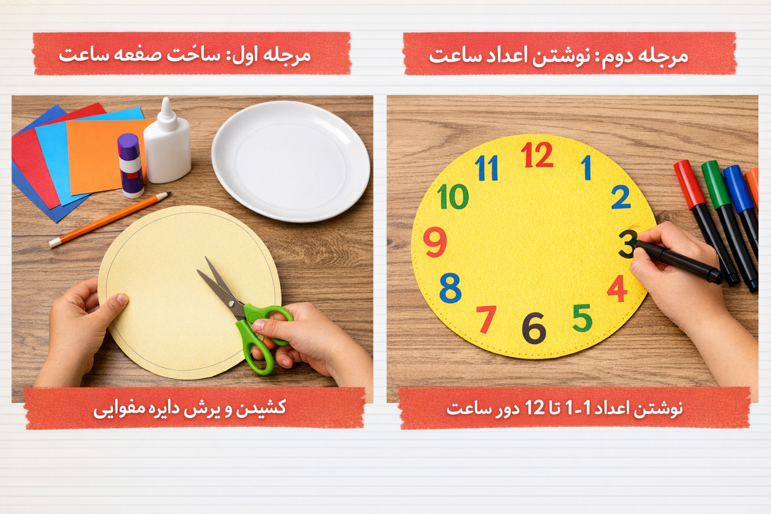 یادگیری مفهوم زمان یکی از مهمترین آموزش ها در سال های ابتدایی دبستان است. دانش آموزان کلاس اول برای درک بهتر زمان، ساعت، دقیقه و ساعت شماری، نیاز به ابزارهای دیداری و عملی دارند. ساخت ساعت با مقوا و کاغذ یک روش بسیار ساده، ارزان و موثر برای آموزش زمان به کودکان است. این فعالیت علاوه بر یادگیری ساعت، باعث تقویت مهارته ای دستورزی، تمرکز، هماهنگی چشم و دست و افزایش علاقه کودک به یادگیری میشود.در این مقاله، آموزش ساخت ساعت آموزشی به صورت کاملا ساده، مرحله به مرحله و مناسب کلاس اول ارائه شده است.امروز در پارسی دی مقاله ی تحت عنوان آموزش ساخت ساعت با مقوا و کاغذ | روش ساده و خلاقانه برای کلاس اول دبستان را می توانید مشاهده کنید.